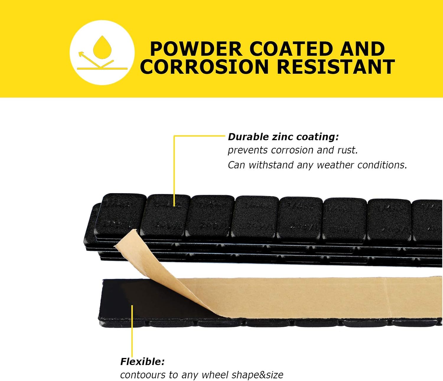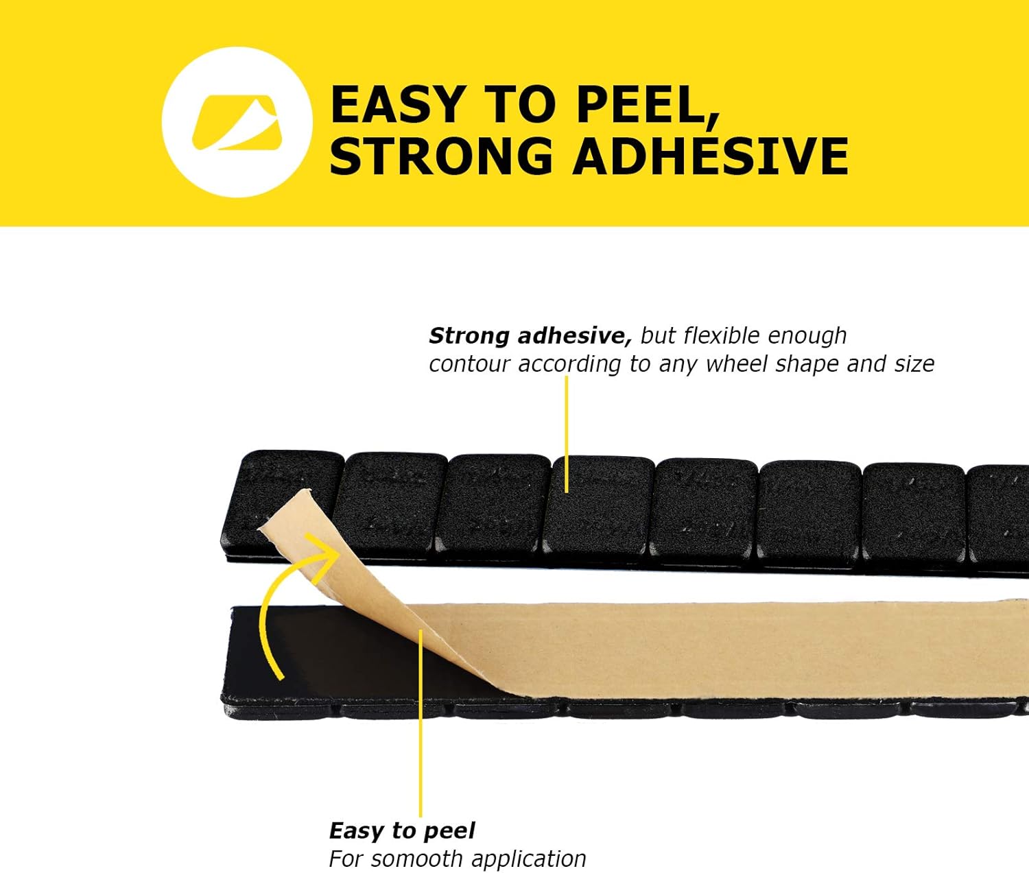 - Peel Off in 1 Second: Features a 2mm extended design, easy to peel backing makes adhering the weight to the tire simple and efficient, and it is flexible enough to fit any wheel shape and size