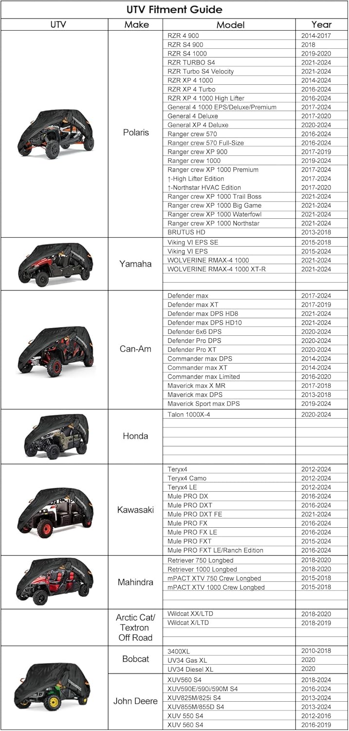 - FITMENT Models: Fits Single Row Seat: 2-3 seater / 2-3 passenger UTV models. Before purchasing, please refer to the size picture (Picture 2) to make sure fit or not . ※※ PLEASE NOTE: ‘’ Can Am Maverick X3‘’ not fit this cover, need to buy a dedicated UTV cover by ASIN ( B08XBBV7C5 )