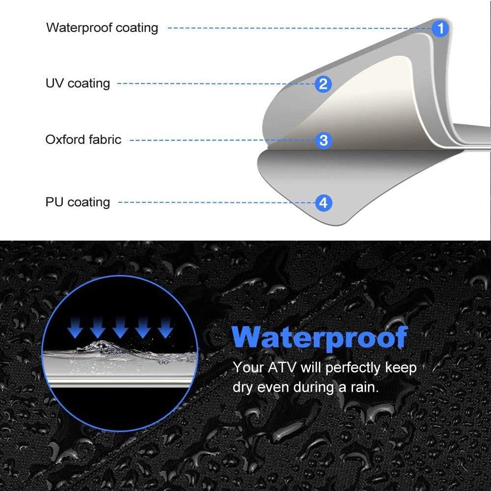 - DURABLE MATERIAL THAN OTHERSL-oxford cloth and our special textile process(Waterproof PU coating). which is more weather-resistant, tear-resistant, and wear-resistant. The entire 4 wheeler cover is made of precision two-thread stitching, absolutely enough firm at the seams. Its product life is 2 times and more than most other ATV Covers.