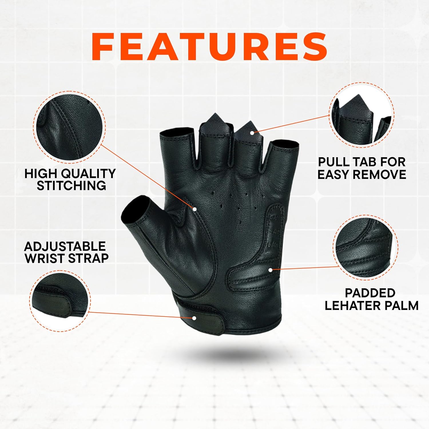 - All-day Comfort: Daniel Smart's black fingerless gloves men Come with Gel Palm for long-term comfort, Pull tabs that are for additional Grip and Easy Removal, and an adjustable wrist strap is also added in the half finger gloves men leather to ensure the best Fit.