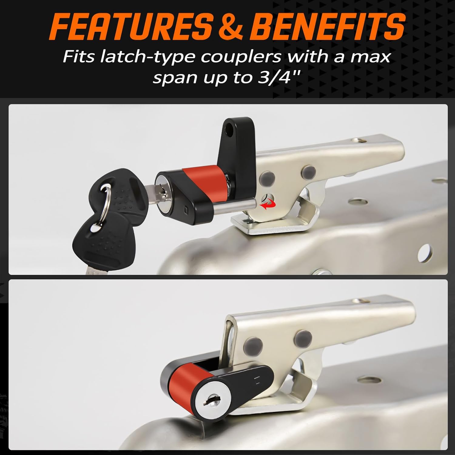 - 【EASY TO USE】- The trailer tongue lock is easy to operate with screw-type locking action -- just turn the key 5-7 times to open or lock, save your time and effort. The trailer coupler lock can be installed quickly and easily so that you can hoop up and head out right away.