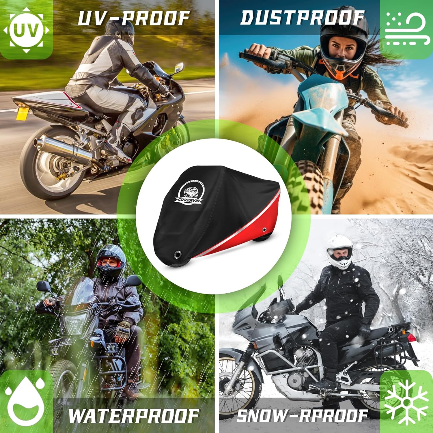 COVERVIN Motorcycle Cover, All Weather Outdoor Waterproof Night Protection with Reflective Strips, Locking Holes and Storage Bag for 86 Inch Suzuki, Kawasaki, Honda, Harley-Davidson(Red M)