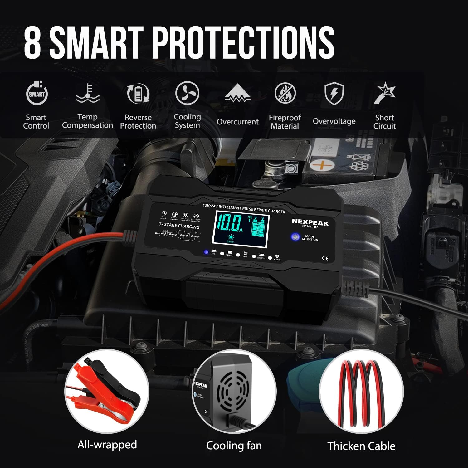 NEXPEAK 10-Amp Car Battery Charger, 12V and 24V Smart Fully Automatic Battery Trickle Charger Maintainer w/Temp Compensation for Truck Motorcycle Lawn Mower Boat Marine Lead Acid Batteries