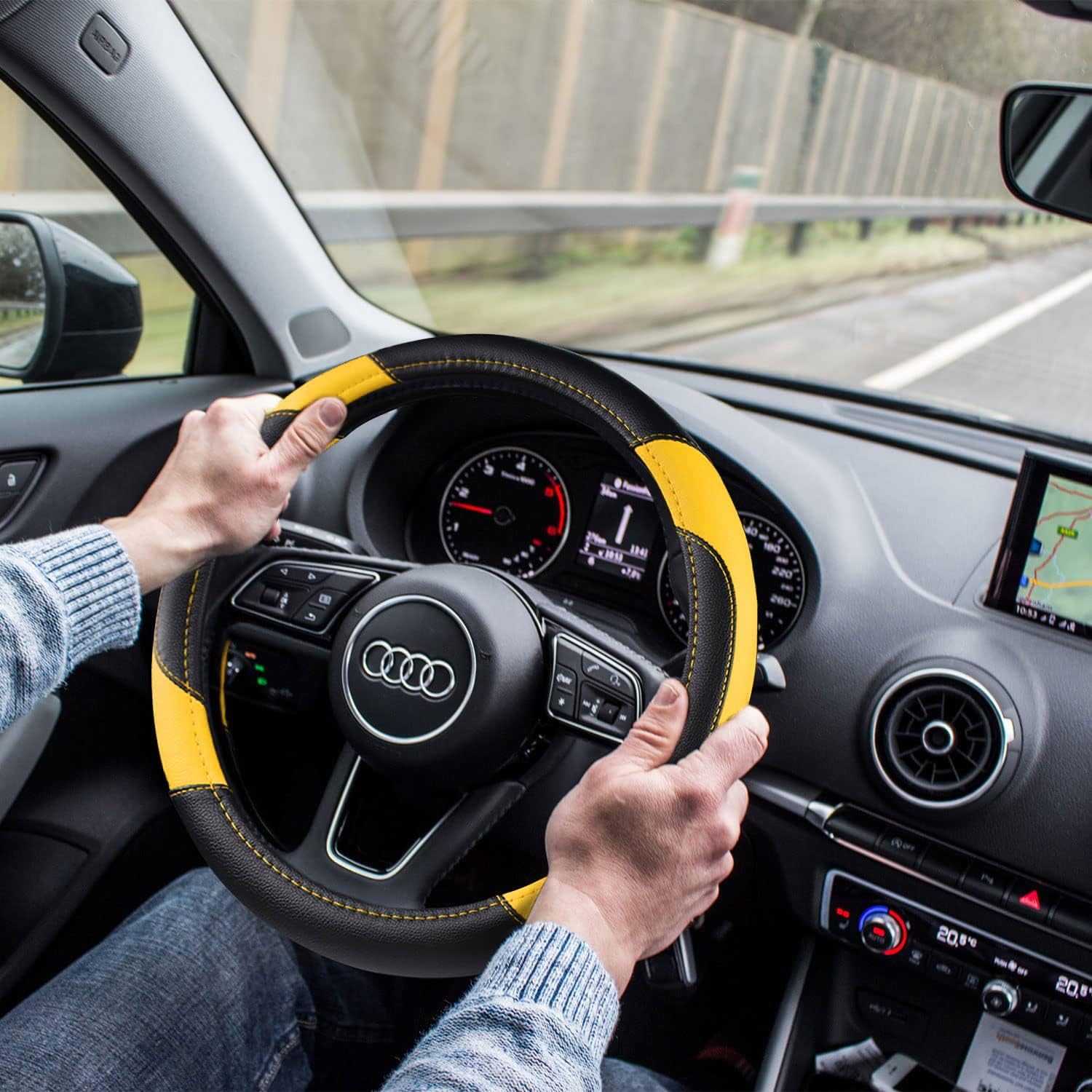 Leather Car Steering Wheel Cover, Non-Slip Car Wheel Cover Protector Breathable Microfiber Leather Universal Fit for Most Cars (Black&Yellow)