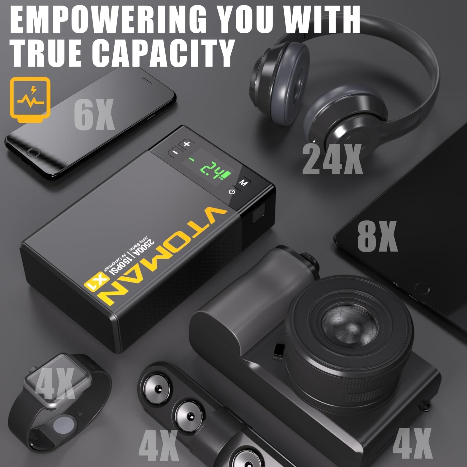 - 【Versatile and Wide-Compatibility Car Battery Starter】This VTOMAN X1 lithium battery car starter integrates multiple practical functions. It is not only a portable car jump starter, but also has tire inflation, pressure gauge, portable power box, 3 modes of lighting (flashlight, strobe light, SOS), dual USB fast charging function. Suitable for roadside crises, outdoor adventures and daily commuting, to meet your various needs.