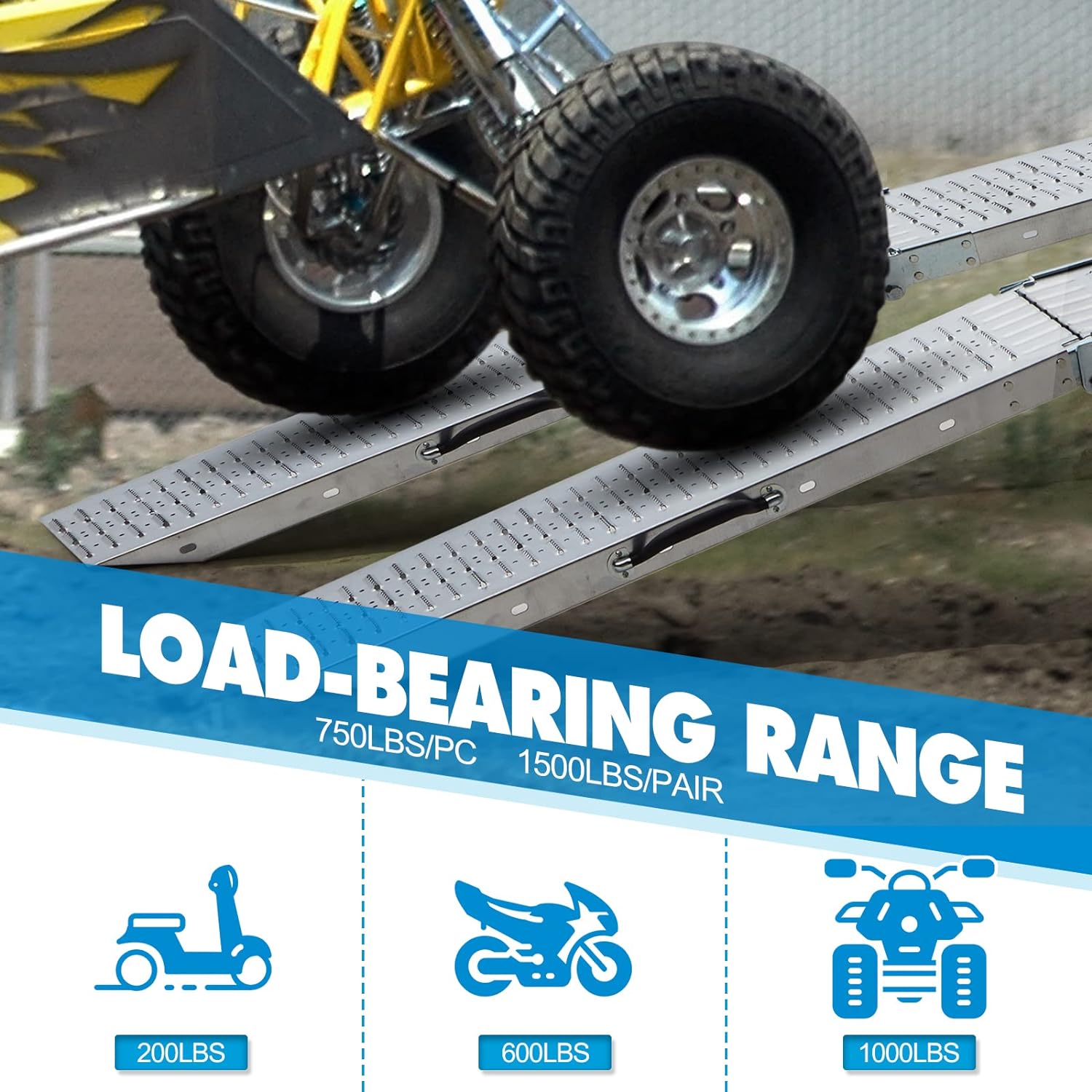 - 【Car Ramp and Practical】: 2 Ramps for Pickup Trucks have a load capacity of 1500lbs per pair and 750lbs per ramps. The atv ramps are made of heavy-duty metal alloy and coated with rust - proof oil,which is more durable and corrosion-resistant. Its all-in-one, large-area sloping tailgate, which touches the surface more firmly than claws, also cushioned the vehicle and slowed it down