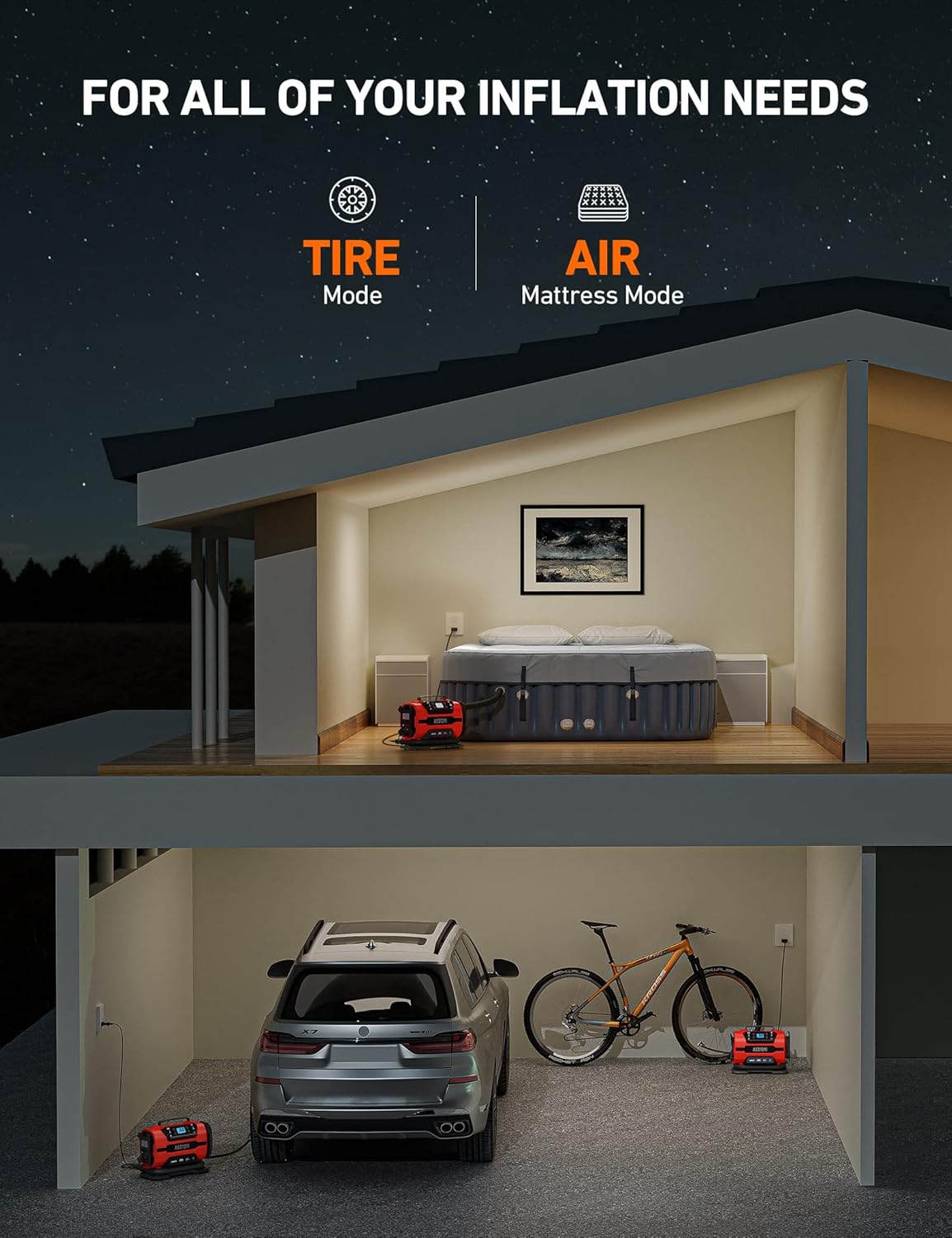 - Tires & Other inflatables: The AstroAI Tire Inflator can easily switch between high-pressure and high-current inflation modes. High-pressure mode inflates car, bicycle and motorcycle tires along with sports equipment and other small inflatables. Large-volume mode inflates bigger low-pressure objects like air mattresses or inflatable rafts.
