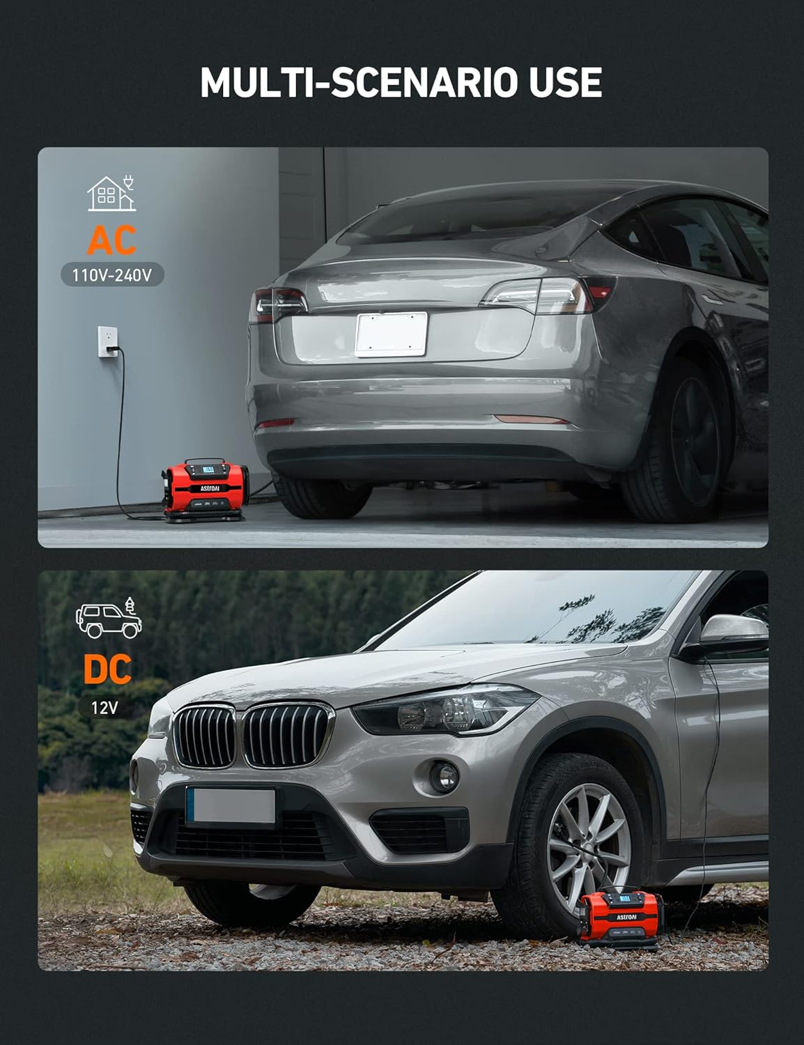 - 12 V DC/120 V AC Dual Power: The AstroAI Tire Inflator features dual power supplies, compatible with 12 V car cigarette lighters and 120 V household outlets, convenient for both home and travel use.