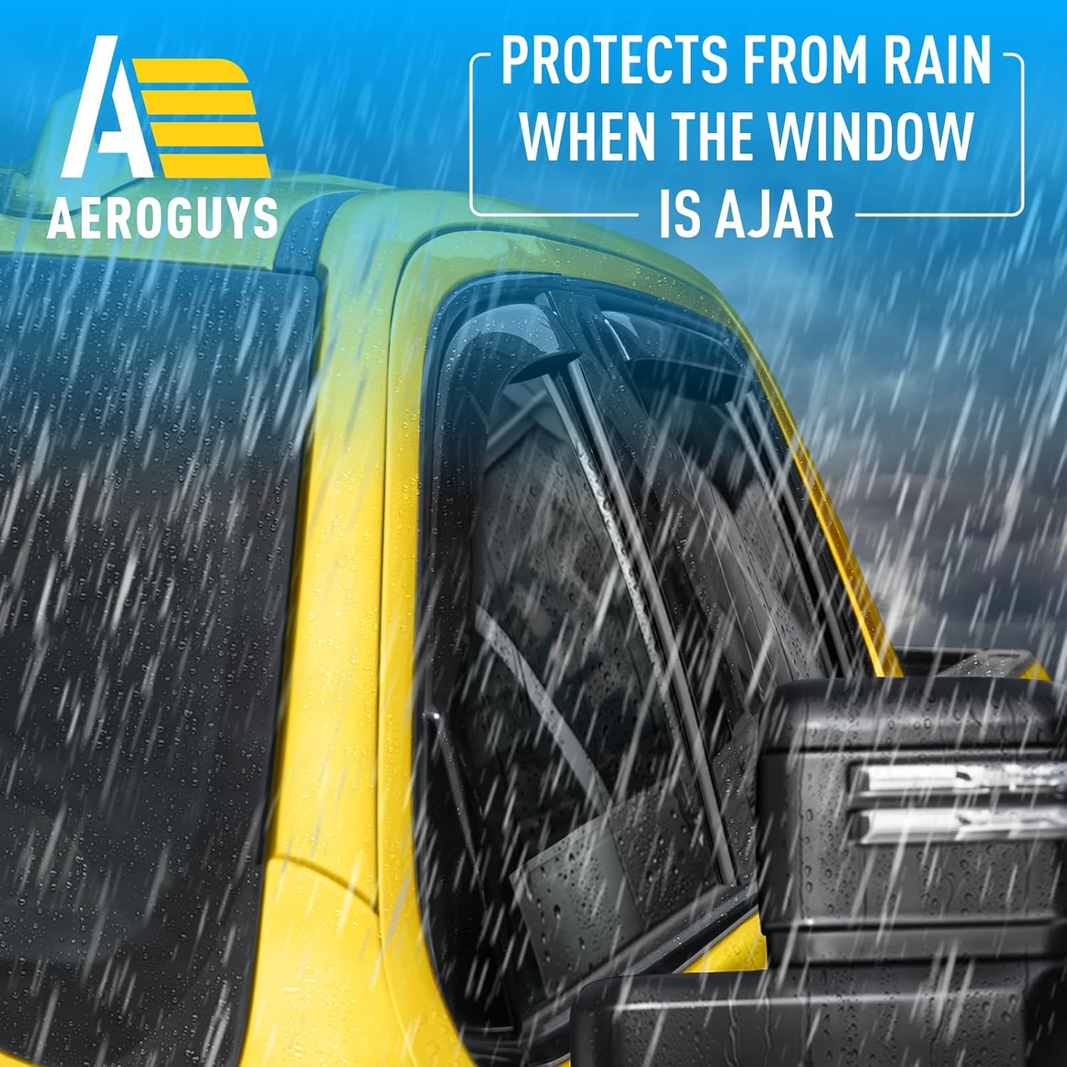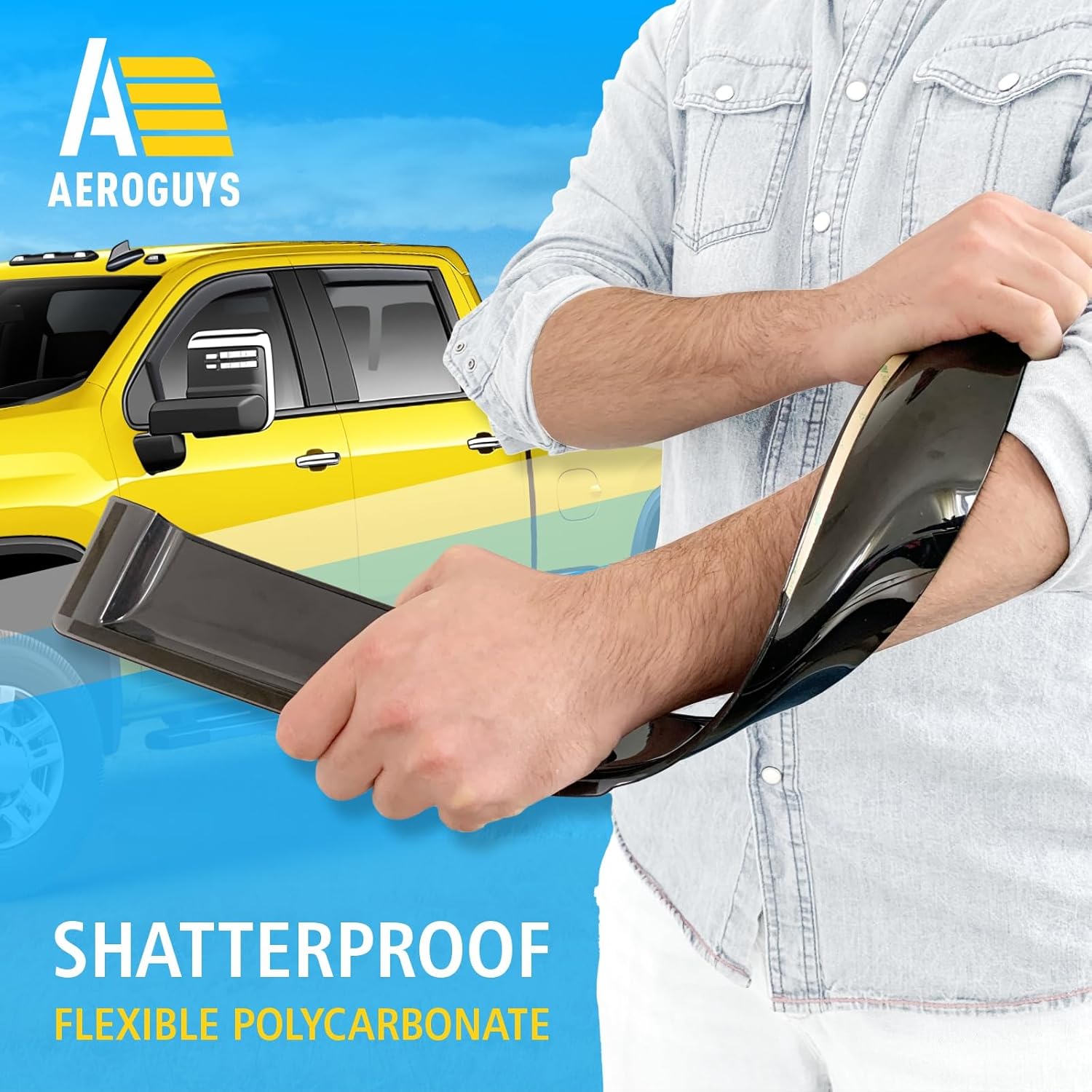 - No Tools Needed, Quick and Easy Assembly โ These rain guards are very easy to fit. IN-CHANNEL INSTALLATION provides perfect fit for your truck. Just slip it onto your truckโs window and your job is done within minutes. There is no drilling or no tools required. Be sure that AEROGUYS window deflectors are water resistant, sun protective and will not bend, break or crack regardless of the weather conditions.