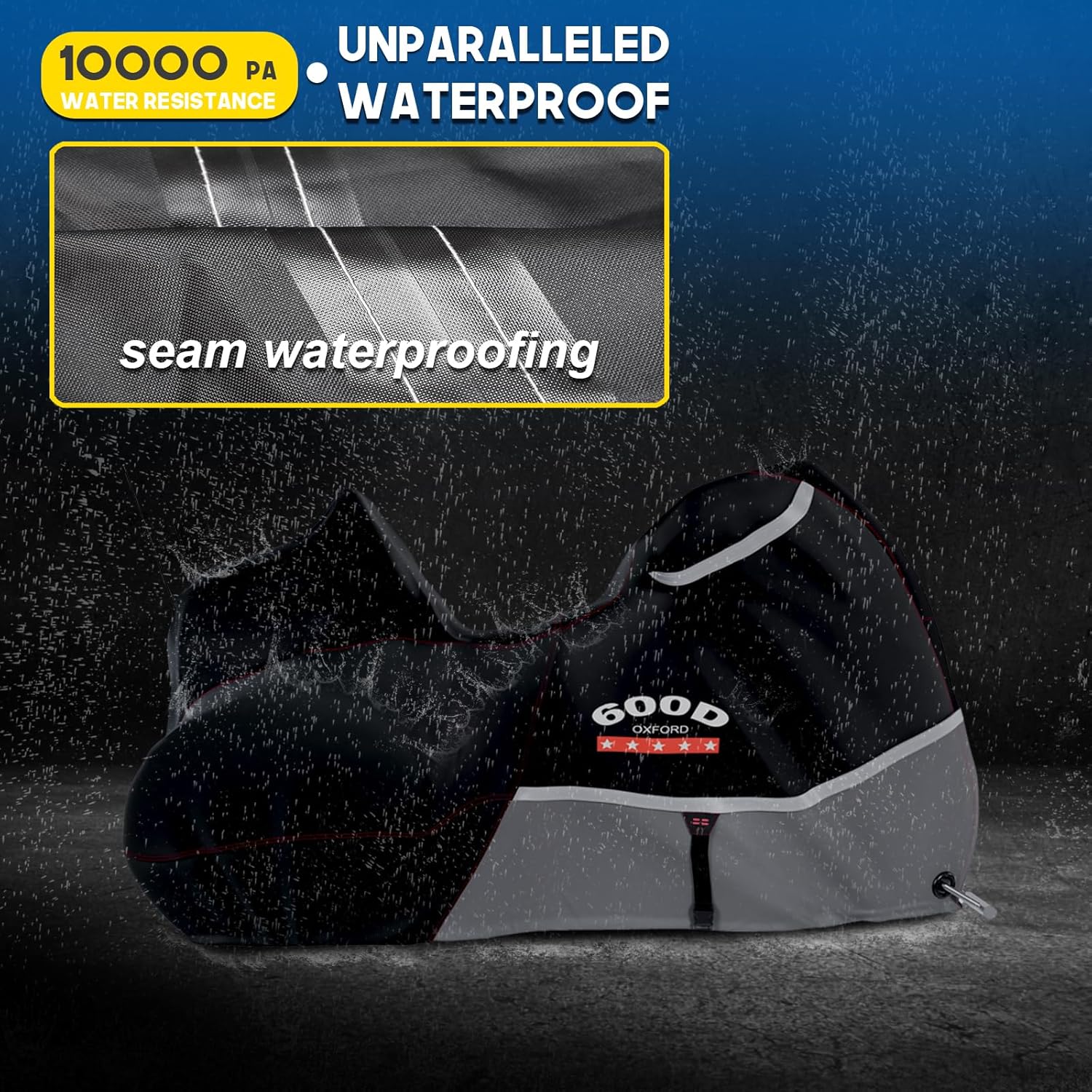 - đ”ăWaterproof and Windproofă:The material used in motorcycle cover is 600D multi-layer Oxford cloth, with the seam applied with glue,so it is rainstorm-proof. Adjustable Hem Cord at the lower hem of the cover can press the cover against the bike body closely. In addition, there is a buckle at the bottom to prevent the cover from being blown away.