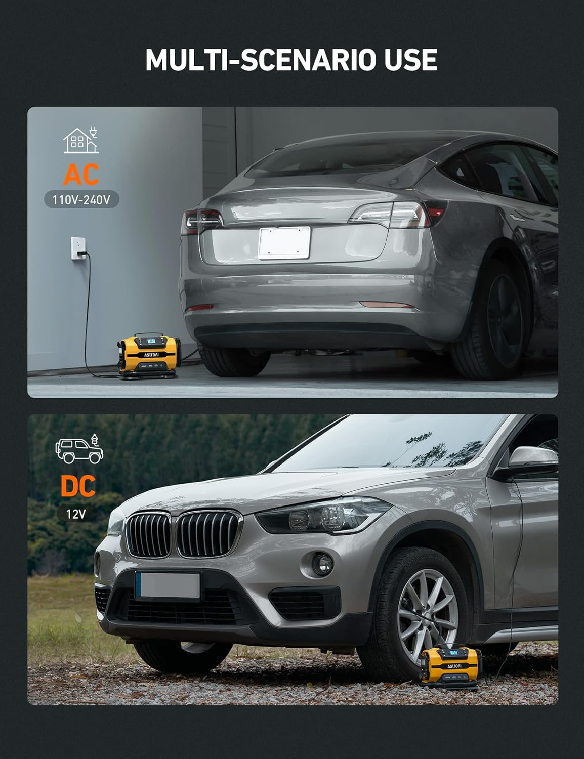 - 12 V DC/120 V AC Dual Power: The AstroAI Tire Inflator features dual power supplies, compatible with 12 V car cigarette lighters and 120 V household outlets, convenient for both home and travel use. The AstroAI Tire Inflator can easily switch between high-pressure and high-current inflation modes. High-pressure mode inflates car, bicycle and motorcycle tires along with sports equipment and other small inflatables. Large-volume mode inflates bigger low-pressure objects like air mattresses.