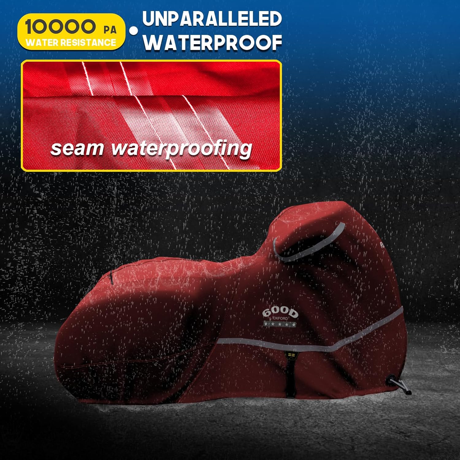 - đ”ăWaterproof and Windproofă:The material used in motorcycle cover is 600D multi-layer Oxford cloth, with the seam applied with glue,so it is rainstorm-proof. Adjustable Hem Cord at the lower hem of the cover can press the cover against the bike body closely. In addition, there is a buckle at the bottom to prevent the cover from being blown away.