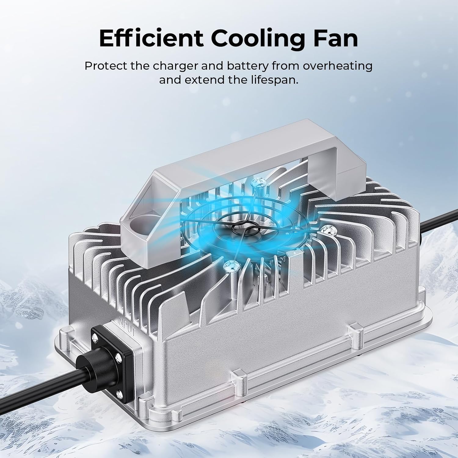 - 【Waterproof and Dustproof Aluminum Die-casting Shell】: The shell is made of aluminum die-casting, the charger is filled with AB glue to protect and cool down the main board and components. The waterproof and dustproof rating of the LifePO4 battery charger is IP66, the AC cable length of 9.8 feet, the DC cable length of 5 feet. It comes with a comfortable handle grip, making it very easy to carry!