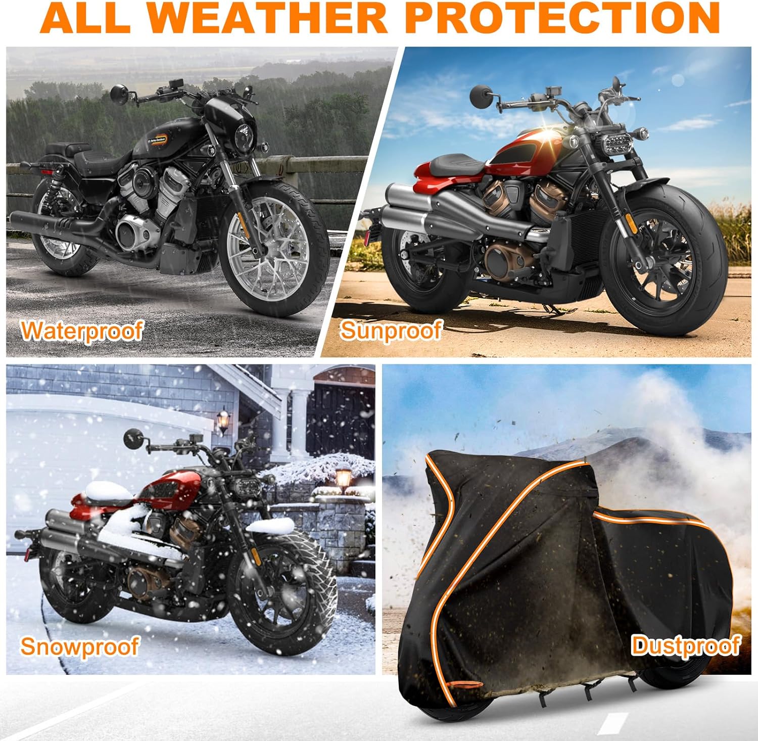 - ăHOW ABOUT THE DETAILSă1. Left and right sides each have a ventilation hole, which can prevent moisture under the cover. 2.Black PU waterproof coating: UV protection, high temperature protection, preventing the interior leather and plastic from cracking and deteriorating 3. Two full orange reflective strips to prevent collision at night and also help you find your motorcycle at a glance. 4. Anti-theft locking holes on the front wheel, perfect protection for your motorcycle, don't worry about losing your motorcycle.