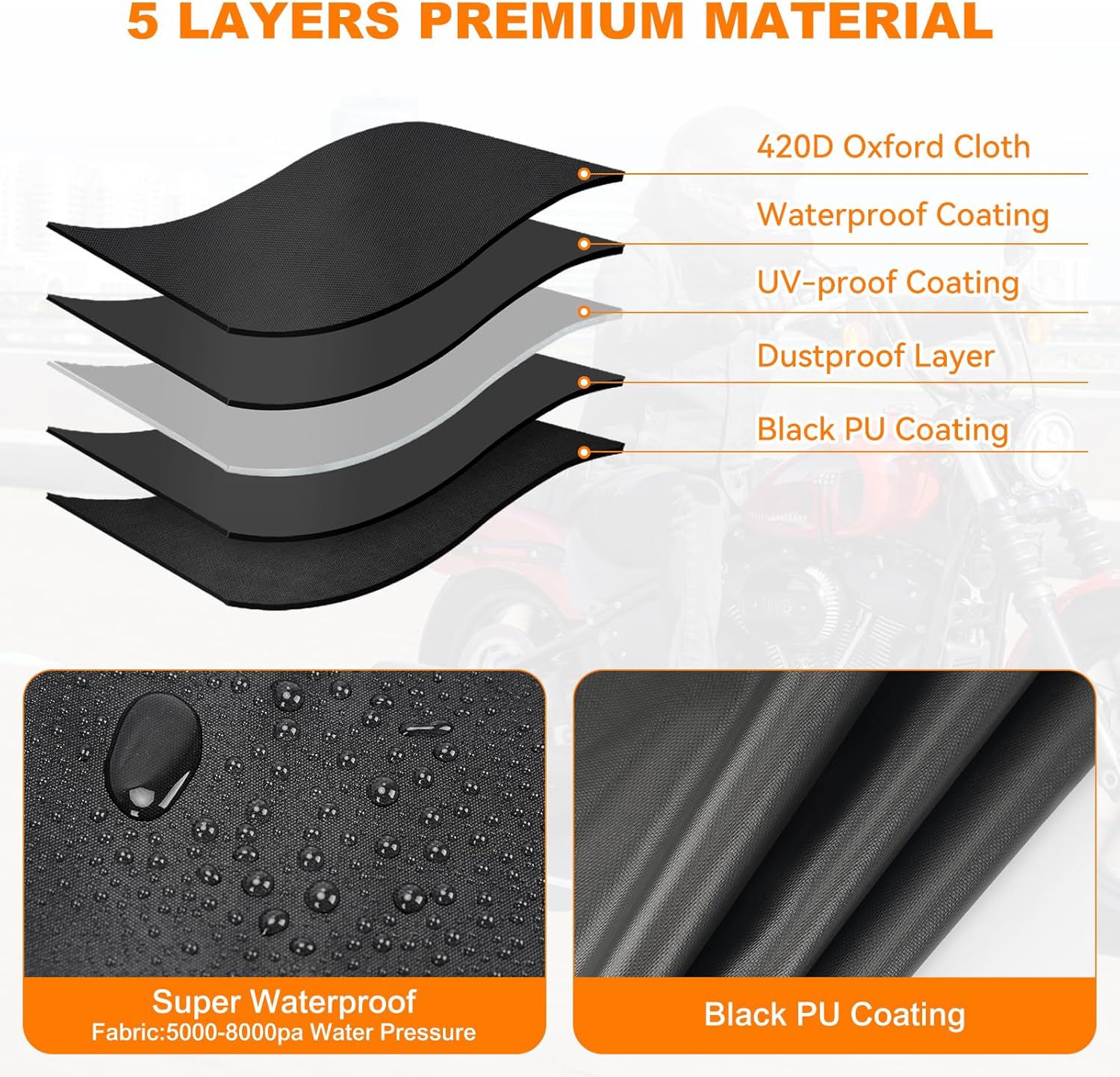 - ăHOW ABOUT THE DETAILSă1. Left and right sides each have a ventilation hole, which can prevent moisture under the cover. 2.Black PU waterproof coating: UV protection, high temperature protection, preventing the interior leather and plastic from cracking and deteriorating. 3. Two full orange reflective strips to prevent collision at night and also help you find your motorcycle at a glance. 4. Anti-theft locking holes on the front wheel, perfect protection for your motorcycle, don't worry about losing your motorcycle.