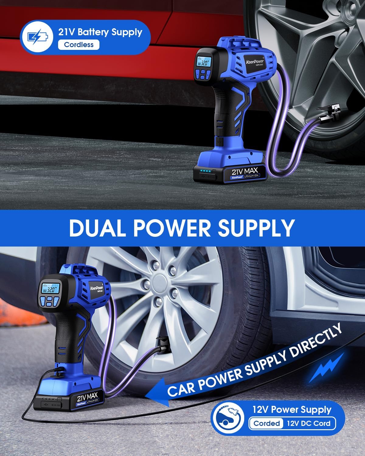 - 【Dual Power Supply】 Featuring dual power supplies, including a 21V lithium battery and DC 12V power options, this portable tire inflator offers flexibility for corded and cordless inflation modes. While on the go, you can rely on its consistent performance, eliminating concerns about power depletion during your travels.