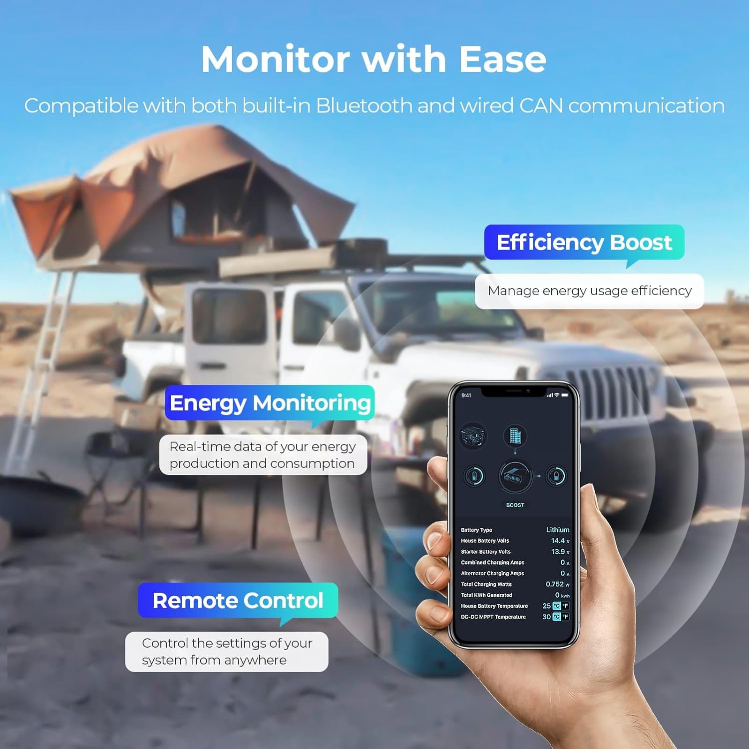- ๐๐๐ฆ๐จ๐ญ๐ ๐๐จ๐ง๐ข๐ญ๐จ๐ซ๐ข๐ง๐ & ๐๐ฎ๐ซ๐๐๐ฅ๐ ๐๐ฎ๐ข๐ฅ๐: Monitor power data in real-time via Bluetooth (DC Home app/Renogy One Core) or wired CAN communication for control. Protected by a sturdy, drop-resistant sheet metal casing, ensuring long-lasting performance in mobile applications.