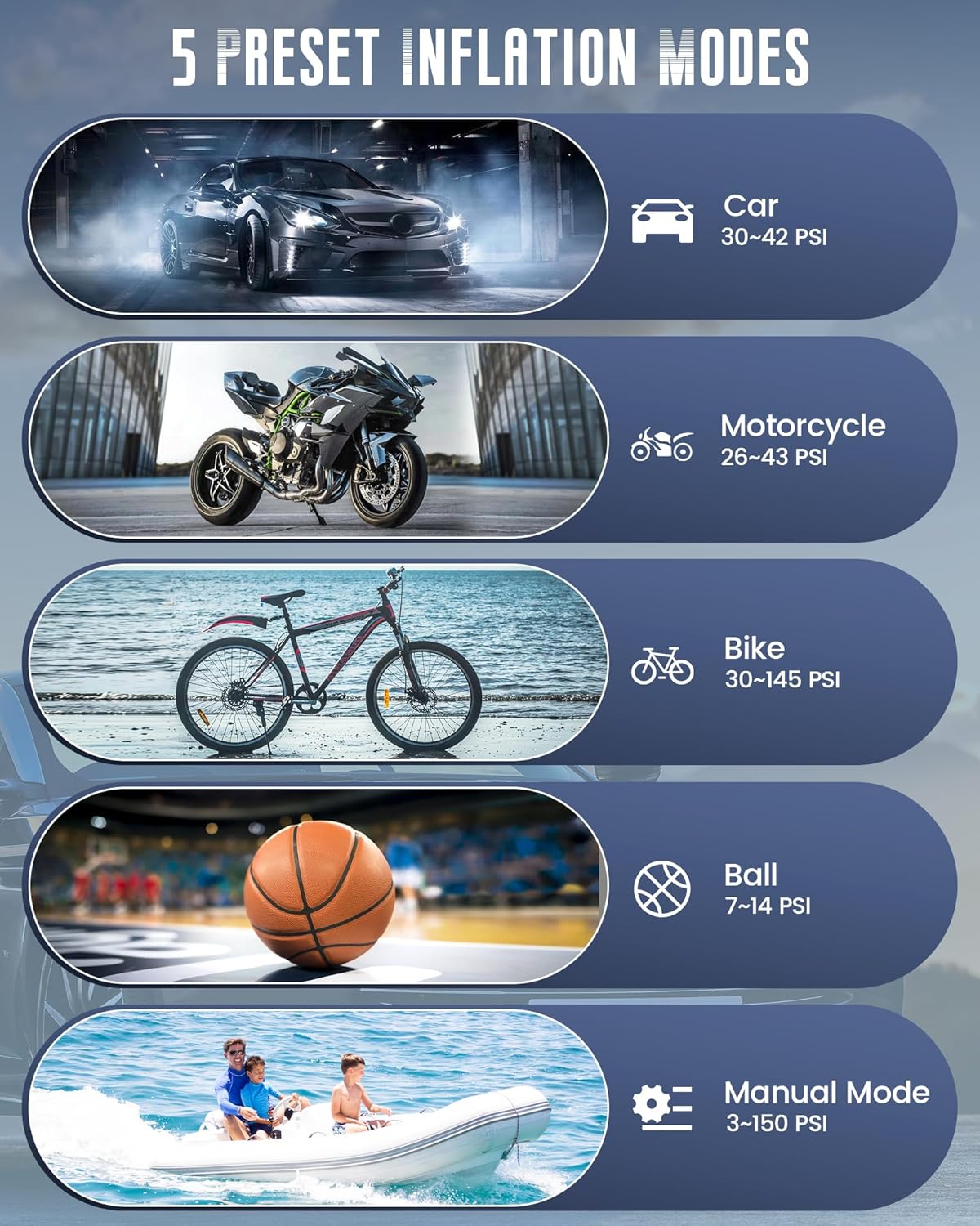 - ๐[SMART INFLATION & REAL-TIME PRESSURE MONITORING]: The tire pump is equipped with a large LCD, and uses a new generation of high-precision sensors and dual LCD to show real-time and preset pressure values with an accuracy of ยฑ0.5 psi. 4 preset inflation modes for inflating bicycles, motorbikes, cars and balls, automatically stops when the preset value is reached. the manual mode allows you to set the pressure value on demand. 4 units to choose, PSIใKPAใBARใKG/CMยฒ