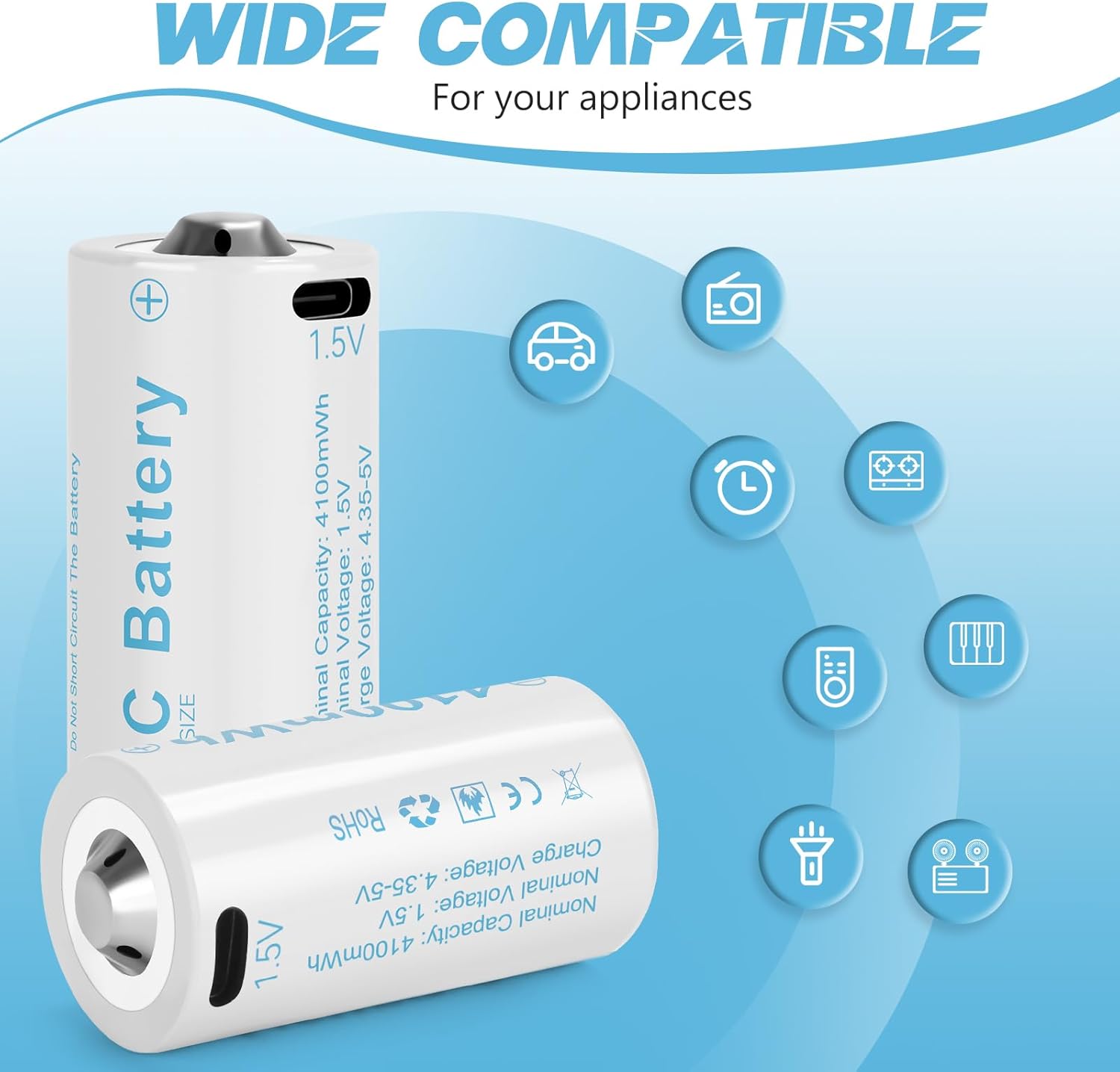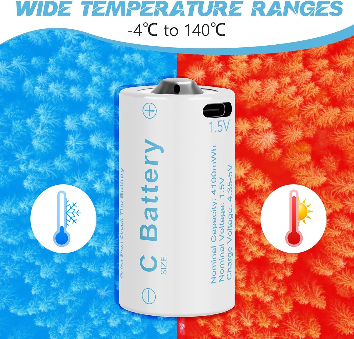 - 【ECO-FRIENDLY RECHARGEABLE DESIGN】With the ability to be recharged of 1000, these C-type lithium batteries are mercury, cadmium, and lead-free are an eco-friendly alternative to traditional disposable batteries