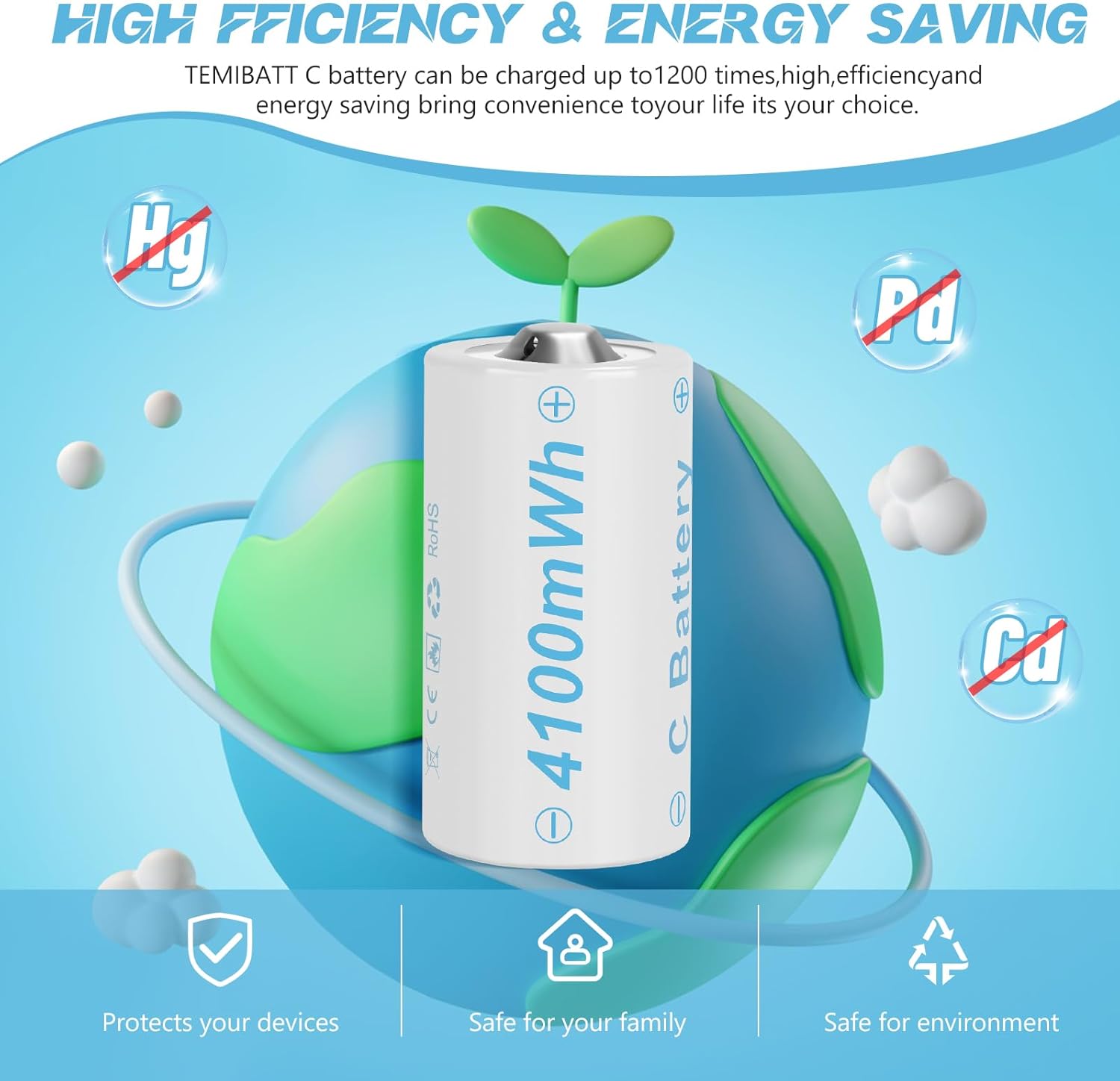 - 【FAST CHARGING TECHNOLOGY】 Our rechargeable C batteries feature fast charging technology, allowing you to quickly recharge them for immediate use. When charging, the LED will hold on red; when fully charged, the LED will remain green