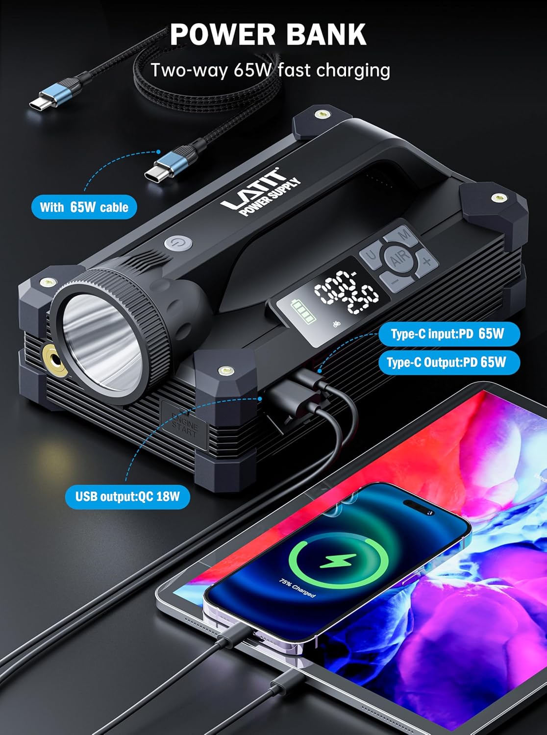 - Power Quick Charger- This jump starter doubles as a mobile power bank with 65W USB-C (input/output) and 18W USB-A ports, it can be fully charged in as fast as 1.5 hours, charging devices up to 80% faster than standard chargers. Its large rechargeable battery 28000mah keeps you powered on the go. ready to power tablets, phones and other devices. (65W wall outlet is included)