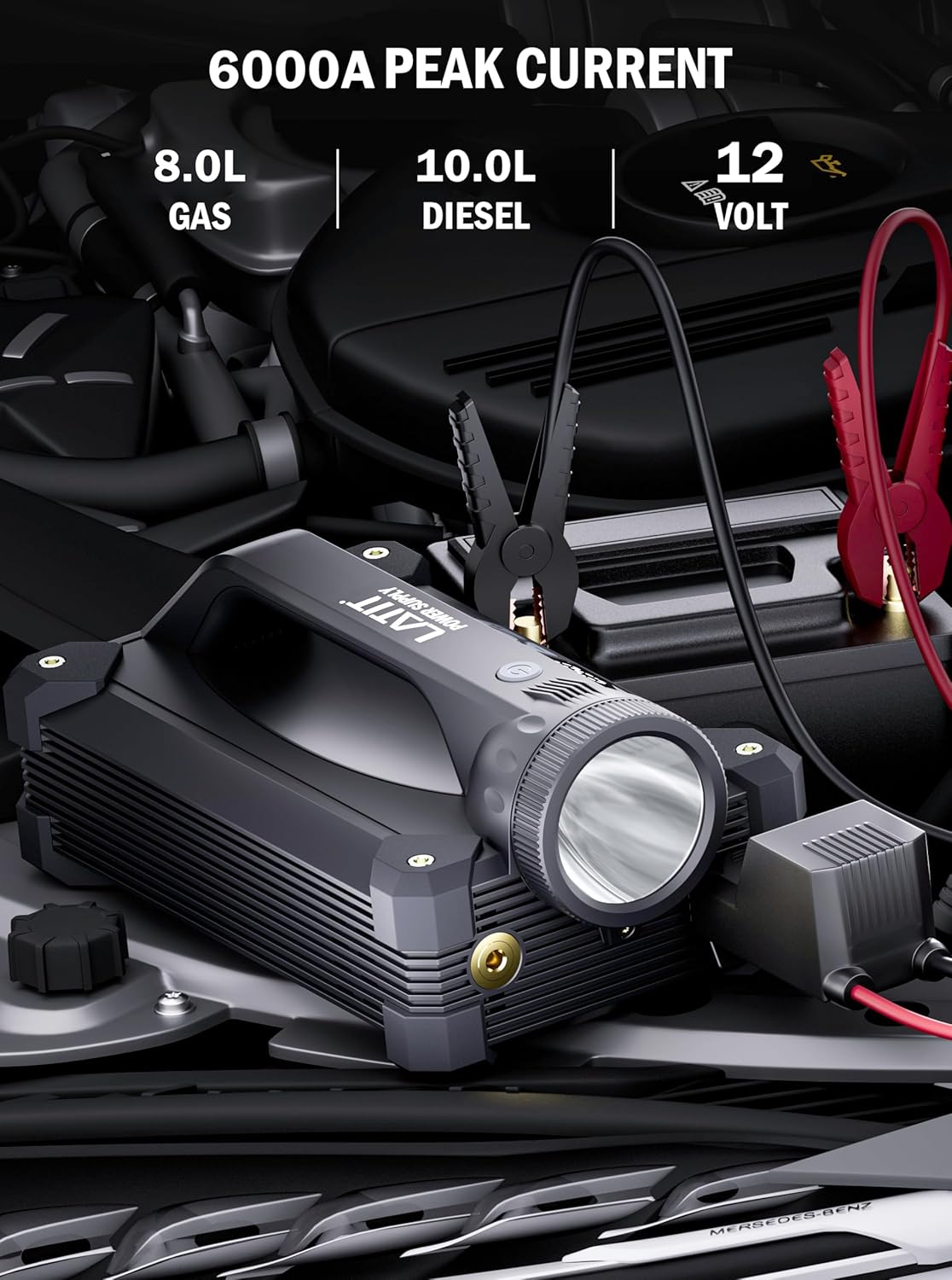 - Powerful Performance - Start low voltage or dead batteries in seconds with LATIT Super peak 6000A jump Starter, is capable of jump-starting 12V vehicles up to 10L gas or 8L diesel engines, This makes it suitable for a wide range of 12 volt vehicles, such as cars trucks, motorcycles, ATVs, snowmobiles, lawnmowers, yachts, etc., No more waiting anxiously for roadside assistance or help.
