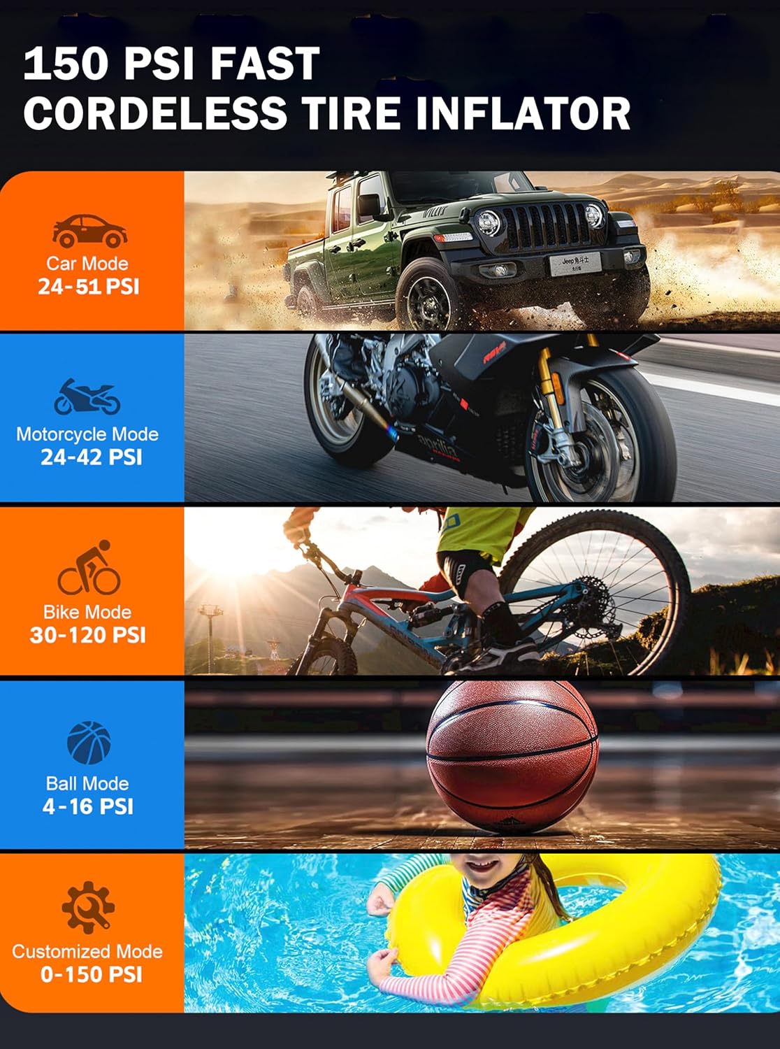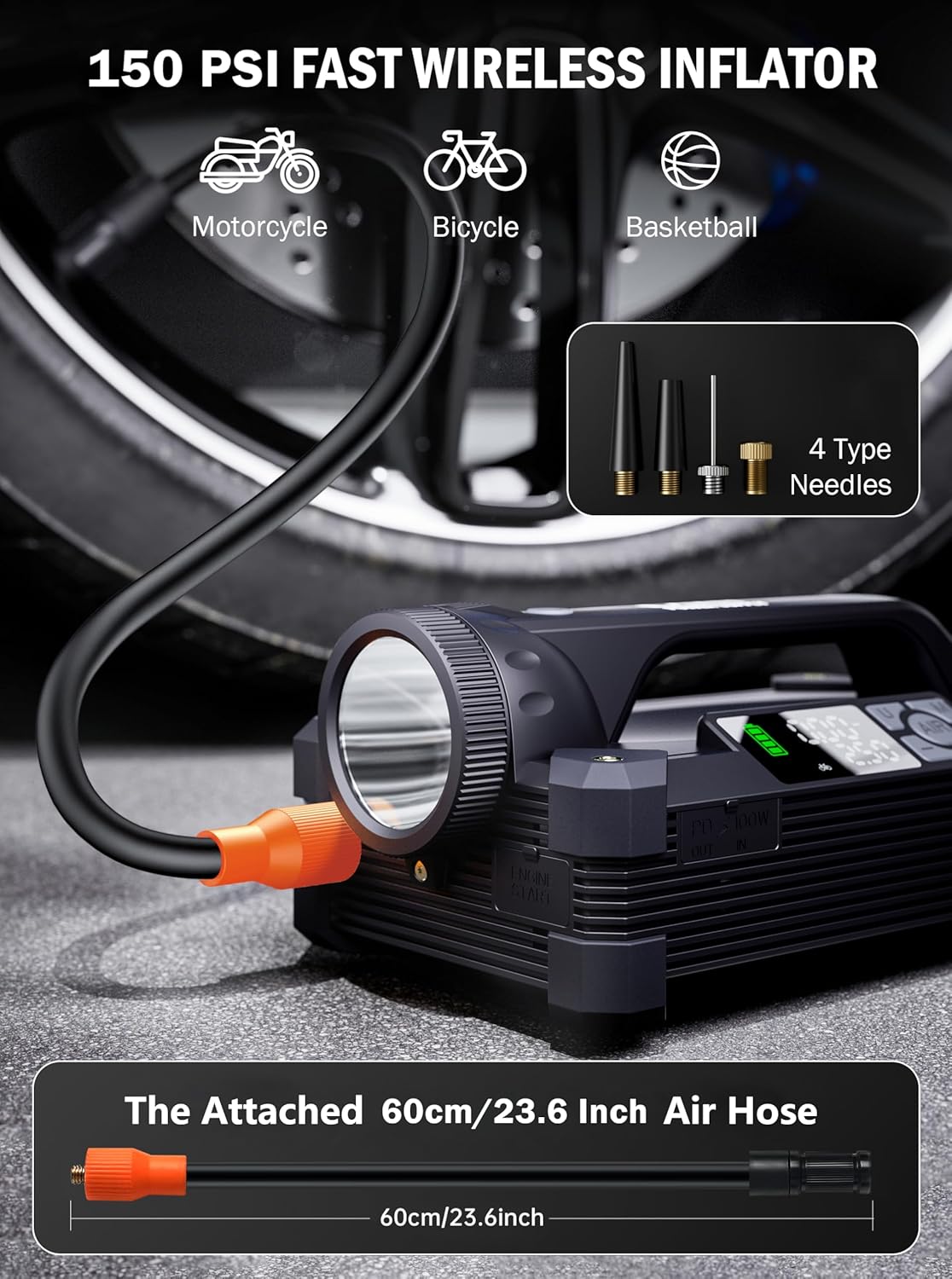 - Quick Air Inflation - This Air compressor’s come in handy and with a digital display. With a powerful aluminum alloy 22 cylinder motor, it Inflate tires quickly up to 150 PSI with 35L/min airflow. The bright LED screen shows real-time pressure in PSI, BAR, KPA, or KG/CM². Features auto shut-off and built-in detection for smart easy inflation. Includes a 23.6" detachable hose and 4 versatile nozzles for vehicles, bikes, balls, and inflatables.