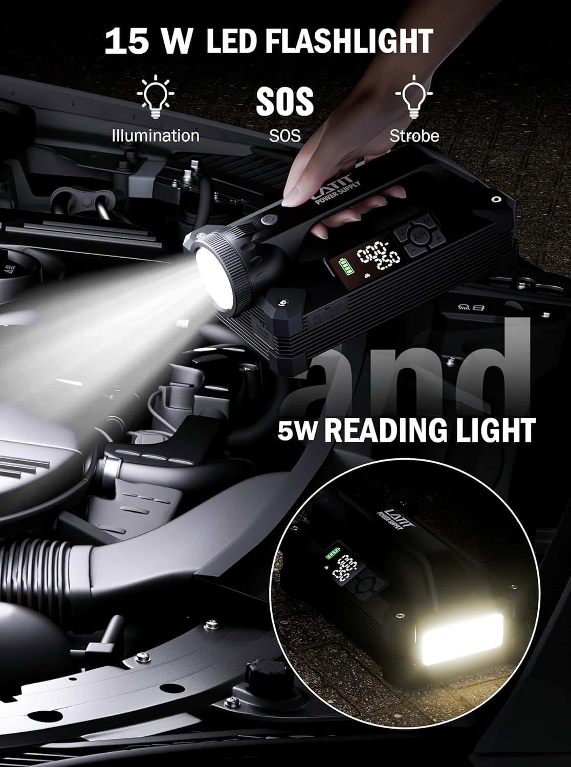 - Ultra Brightness Lights - Illuminate the night with a 2000-lumen beam reaching over 300 meters. Switch between standard, SOS, and strobe modes. Includes a 5W COB camping light for soft, glare-free illumination during overnight use - making it an essential emergency device for off-road trips or outdoor adventure rescue.