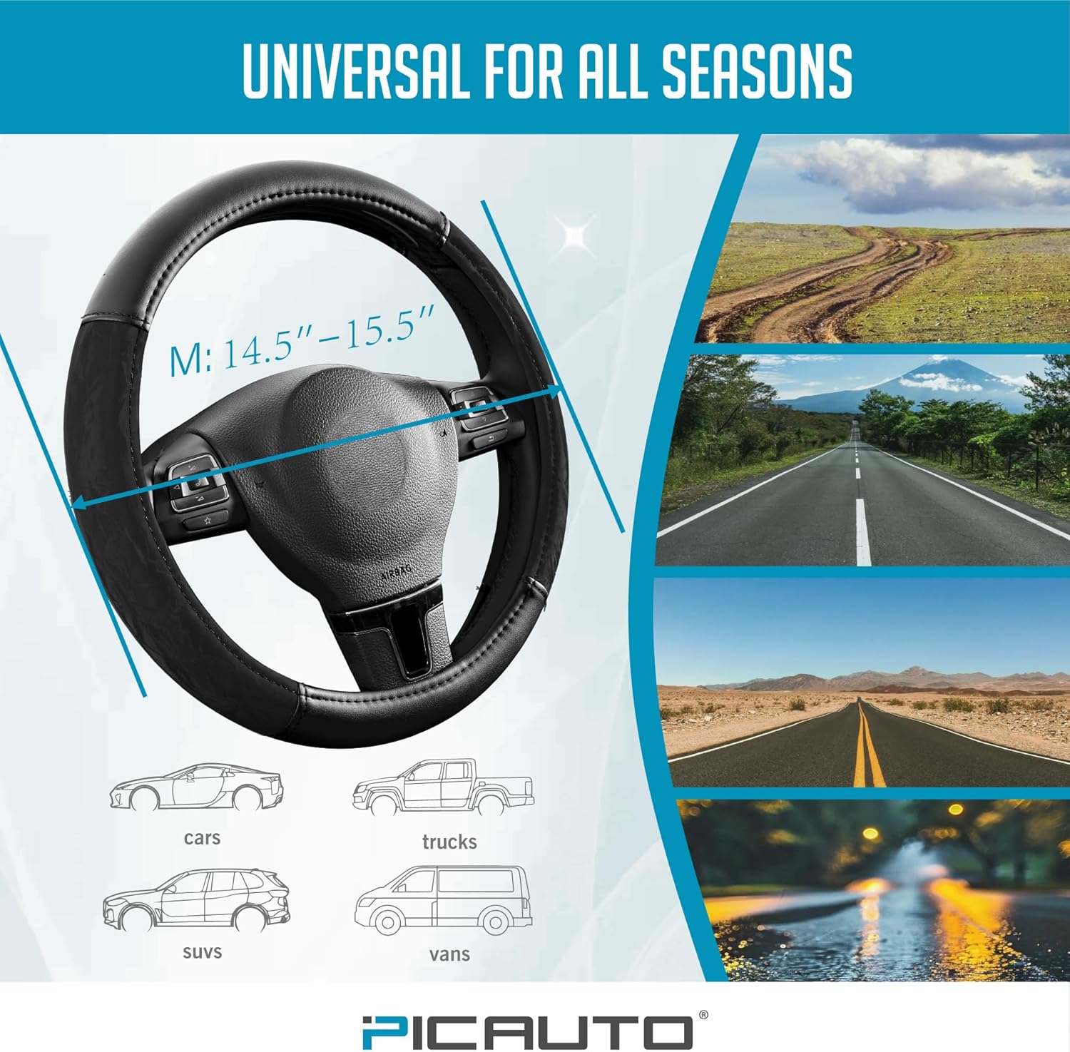 PIC AUTO Steering Wheel Cover, Silk Grain Leather Car Steering Wheel Protector, Comfortable Grip, Universal 14.5-15.5 Inch Anti-Slip Steering Wheels Accessories for Men & Women (Black)
