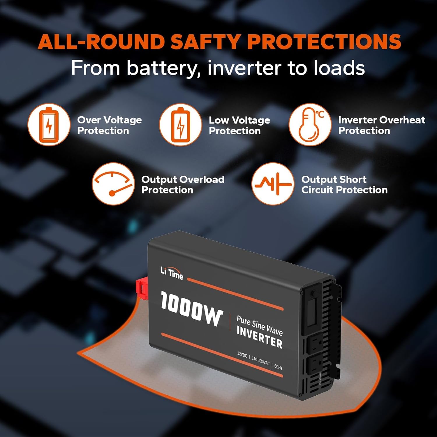 - 91% Powerful Conversion Efficiency: LiTime 12V 1000W inverter perfects for LiTime 12V series batteries. The pure sine wave inverter ensures stability, allows you to realize your pursuit of achieving the best energy system. LiTime 12V to 110V pure sine wave inverter provides 1000W continuous DC to AC power, 2000W peak surge during load start-up (Reliable conversion efficiency at 91%).