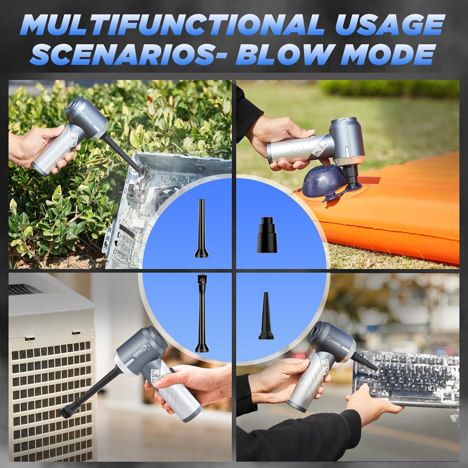 - ă3-In-1 Multifunctional DesignăSaker mini vacuum cleaner is equipped with multiple accessories and can be used for various scenarios such as inflation, soot blowing, dust removal,let us enjoying the convenience of a multifunctional device. You can use this handheld vacuum cordless to clean difficult cleaning crevices such as cabinet corners, drawers, computer keyboards, and mainframes, as well as inflate lifebuoys or air mattresses.
