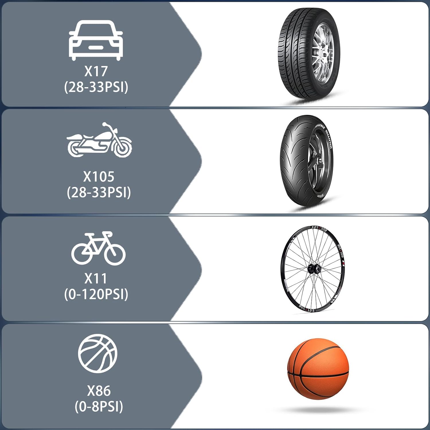 - One-Touch Inflation: Select from 4 preset modes (car, bicycle, motorcycle, ball) and 4 pressure units (PSI, KPA, BAR, Kg/cm²), Our smart chip remembers your last setting for effortless, one-click inflation. No more over-inflation worries, ensuring precision and convenience.It makes a practical present for fathers, husbands, or friends