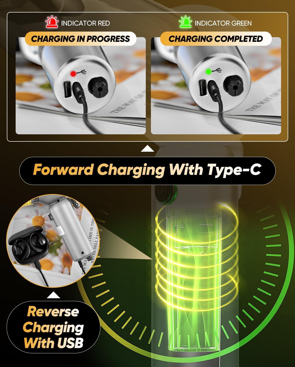 - ăTwo Different Charging InterfacesăThe Saker car vacuum portable cordless is equipped with a built-in 3 * 2600mAH battery, which is rechargeable and reusable, making it more environmentally friendly and energy-efficient. The 6-in-1 car vacuum cleaner has two different charging ports. One uses a Type-C data cable to charge the vacuum cleaner, and the green indicator light can promptly remind you that the battery is fully charged. A USB charging cable that can be plugged in to connect the other end to a device that needs to be charged, such as a phone, tablet, etc.