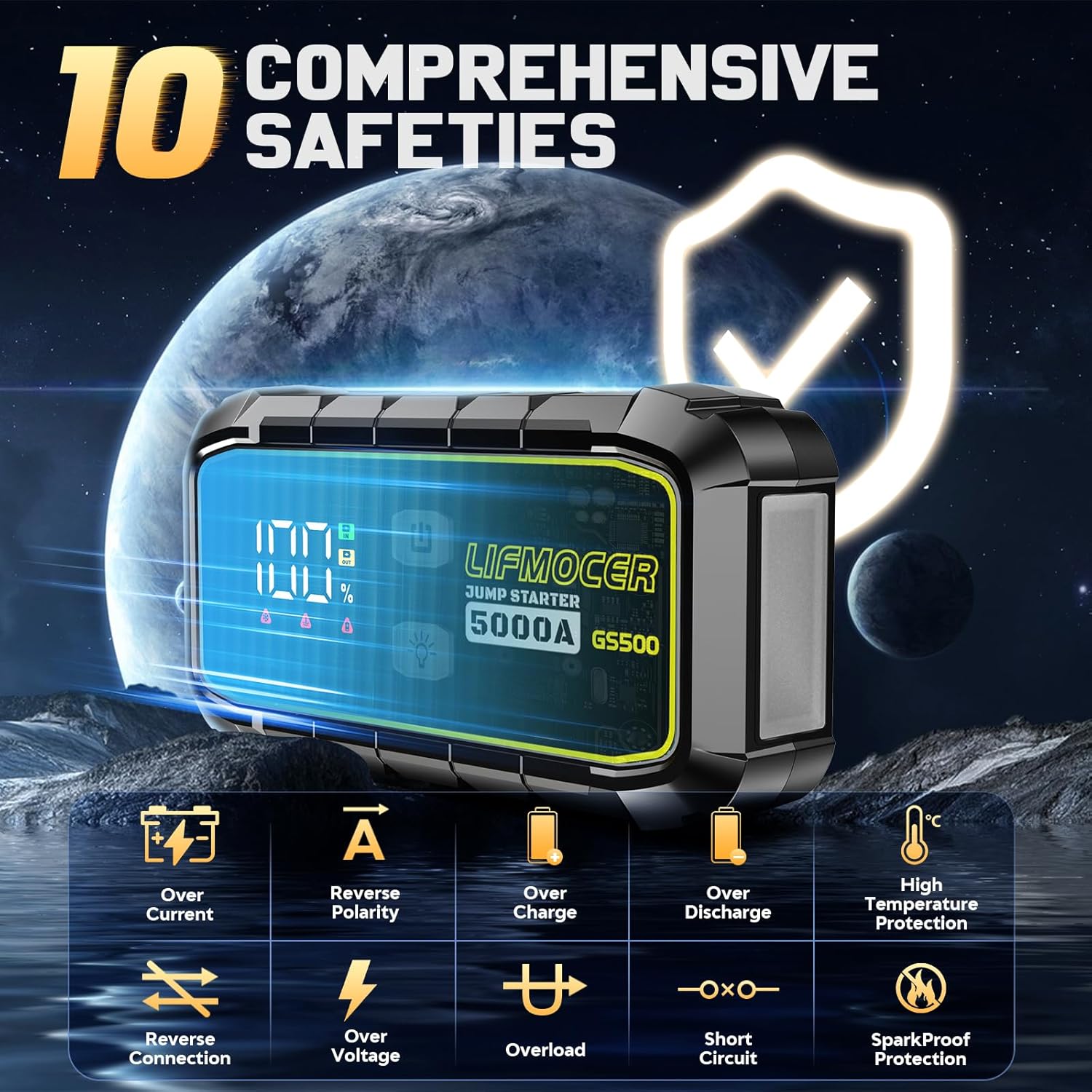 - ăLIFMOCER 5000A Jump StarterăWhen you have dead batteries on a road trip, you don't have to guess by the indicators anxiously or wait hours for AAA/someone for help on desolated interstates.With a powerful battery, This jump pack Can easily jump start (up to All gas or 10.0L diesel) 12v vehicles in 1-2 seconds