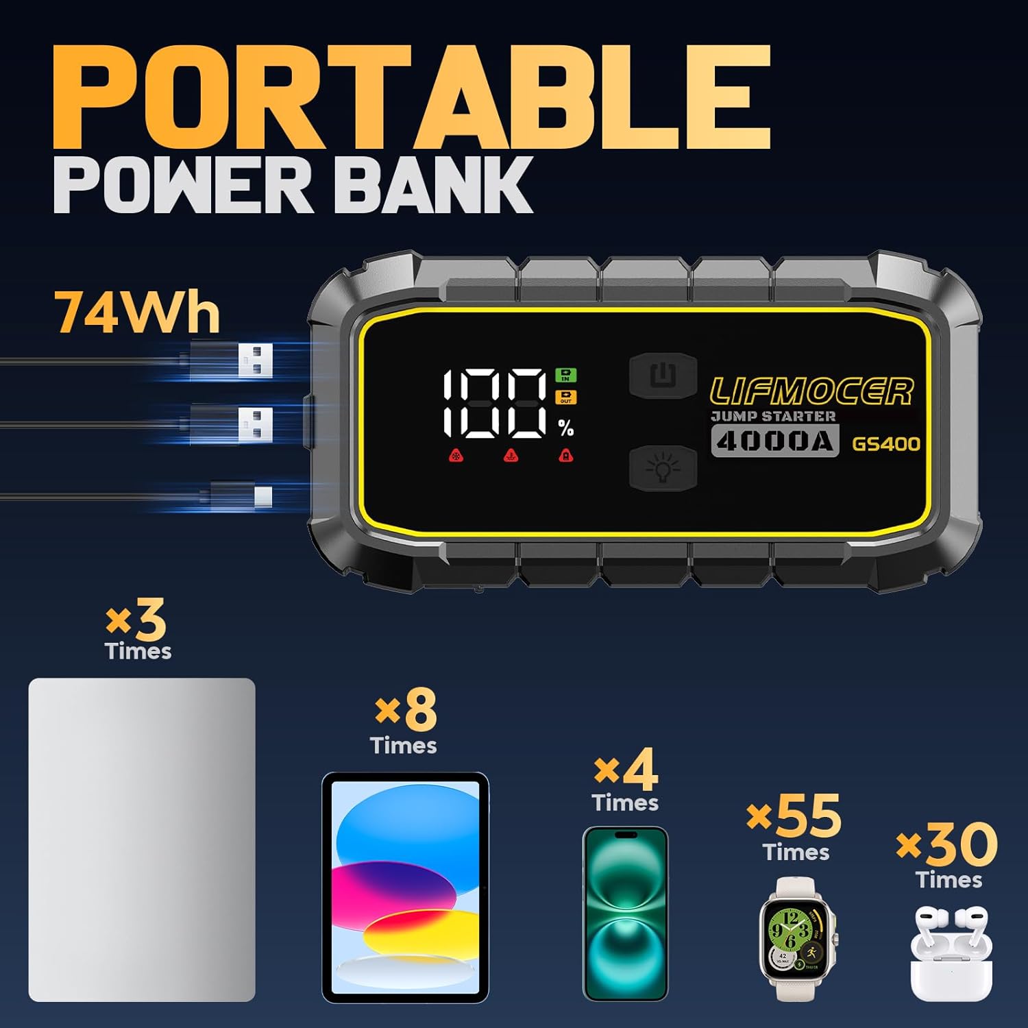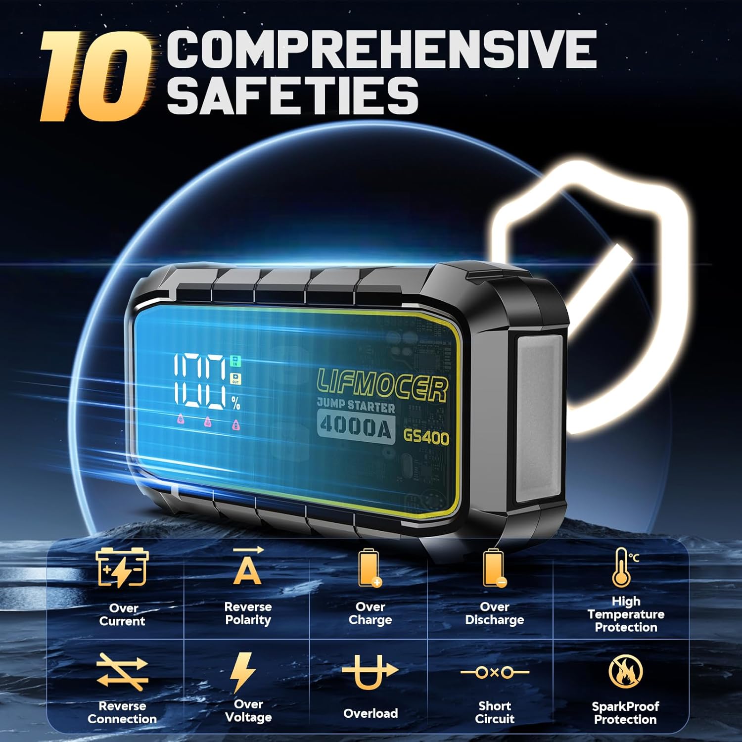 - ăLIFMOCER 4000A Jump StarterăWhen you have dead batteries on a road trip, With a powerful battery, This jump pack Can easily jump start (up to 12.0L gas or 10.0L diesel) 12v vehicles in 1-2 seconds