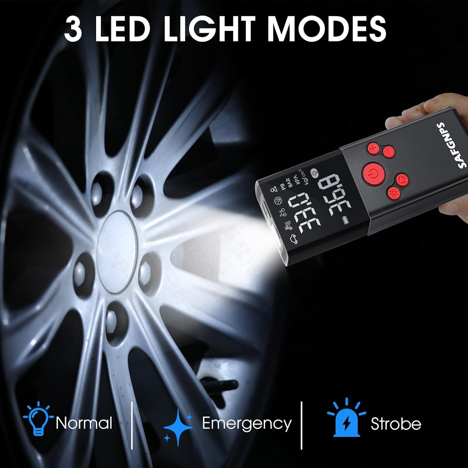 • 【All-in-One Device】Not just an inflator air pump: Portable tire pump for car features 3 LED emergency modes (SOS, Steady, Strobe) for nighttime/emergency use Battery air pump includes Power Bank function to charge your devices in emergencies