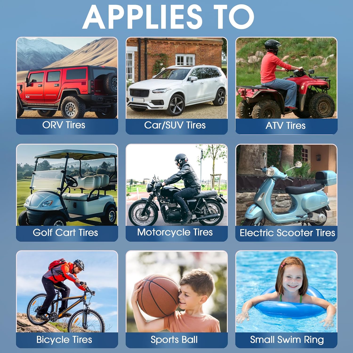• 【5 Smart Modes + Auto Shut-Off】The portable inflator pump offers 4 preset inflation modes (Car/Motorcycle/Bicycle/Ball), and a 5th user-friendly custom mode, set target pressure (0-150PSI adjustable) based on your inflation needs, the car tire air pump portable automatically stops when reaching target pressure, eliminating overinflation risks, perfect for diverse inflation needs