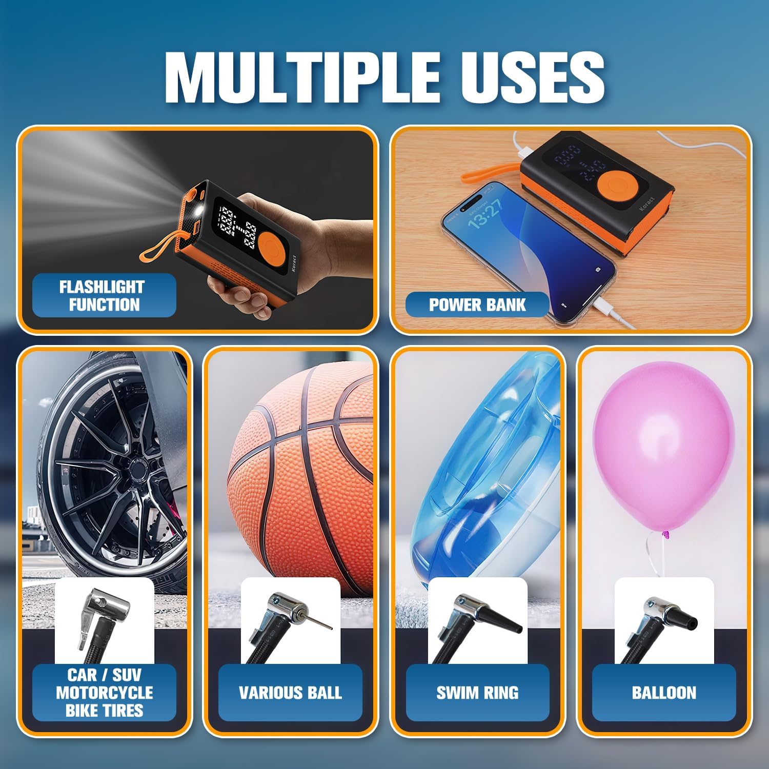 - Convenient & Compact: This tire inflator is small and lightweight, weighing less than 1.5lb, and can be easily put into a car, motorcycle rack, or backpack. The portable tire inflator is suitable for home, outdoor sports, road trips, and car emergencies. Package Included: Tire Inflator*1, Air Hose*1, Tapered Nozzle*2, Ball Air Nozzle*1, Presta Valve Adapter*1, USB Charging Cable*1, Storage Bag*1, User Manual*1