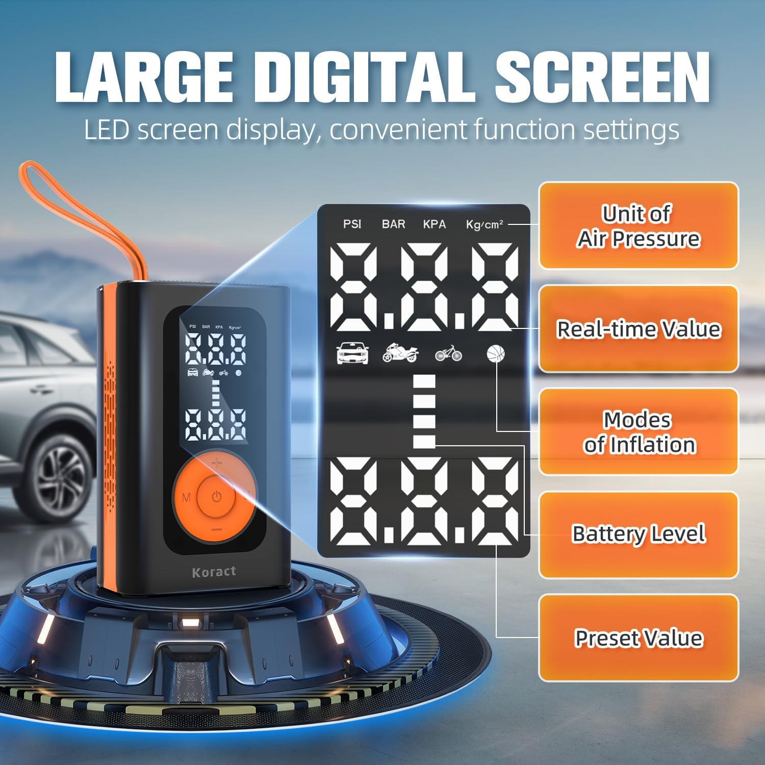 - Smart Auto-Shutoff Function: Press the "Start" button and the air compressor portable will automatically inflate according to your preset target pressure. When the set pressure value is reached, it will automatically stop inflating. The tire inflator provides 4 smart inflation modes (car, motorcycle, bicycle, ball) and custom mode, and 4 inflation units (PSI, Bar, kPa, kg/cm²) for you to choose