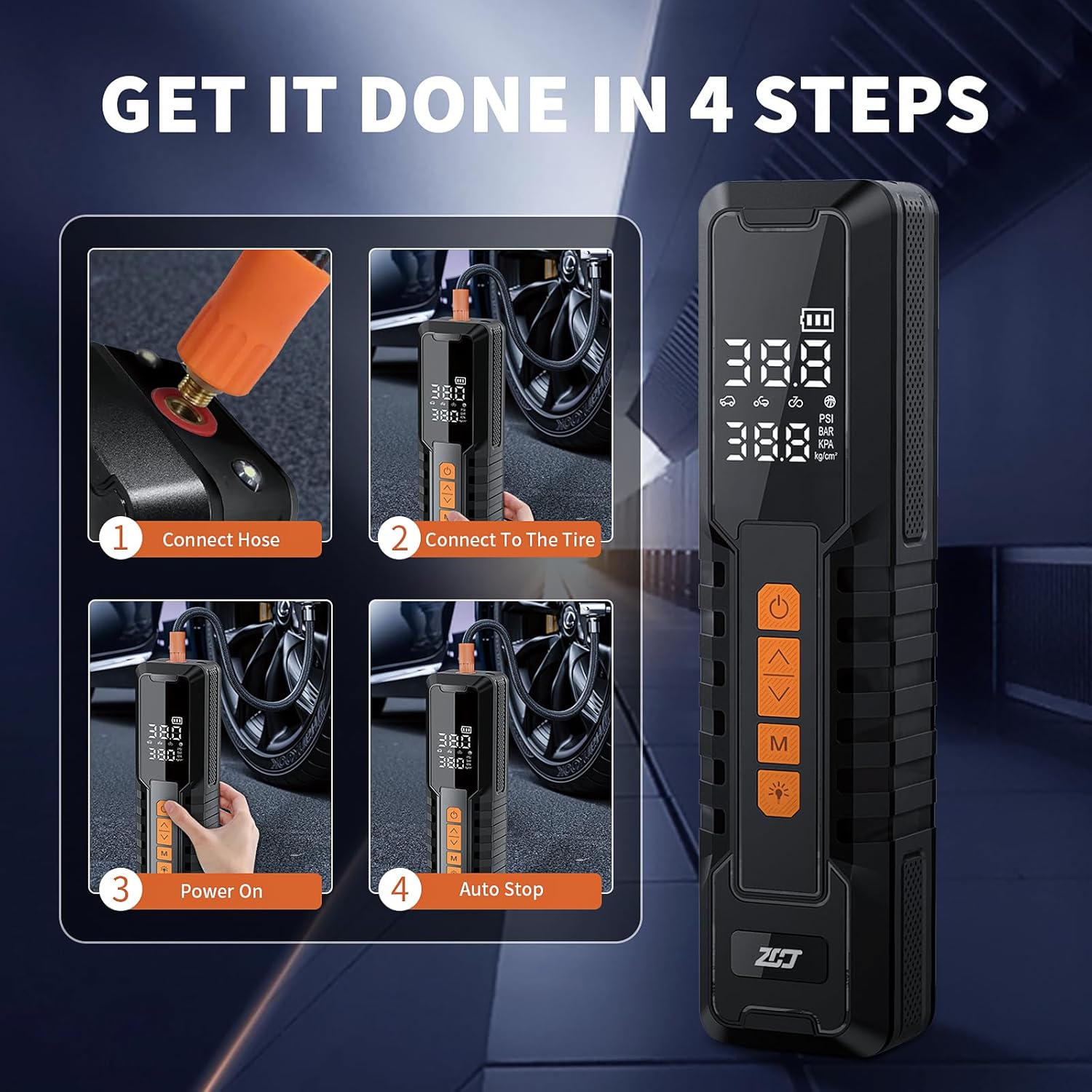 - 【Easy Operation, Automatic Precise Inflation】This cordless air compressor works in just 3 simple steps: connect to the tire → power on → automatic inflation to the preset pressure. The built-in preset modes for Car/SUV (30–42 PSI), Motorcycle (26–43 PSI), Bicycles (30–130 PSI), Ball (7–14 PSI), and Swimming Rings (5–10 PSI) , maximum pressure of 150 PSI. This auto air tire inflator features precise tire pressure measurement and automatically stops once the target pressure is reached