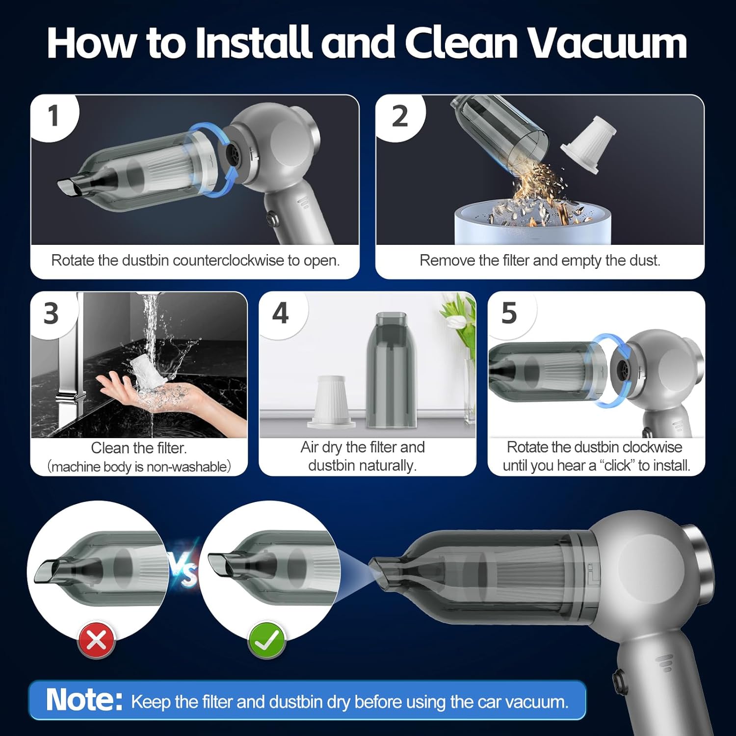 - ăReplaceable HEPA Filteră Equipped with 2 high-quality HEPA filters, this handheld vacuum cordless supports replacement for continuous use. The HEPA filters capture even the small particles, ensuring cleaner air after each use, whether you're using it as a car vacuum cleaner or a home hand vacuum. For best performance, simply clean and dry the filters after 1â3 uses.