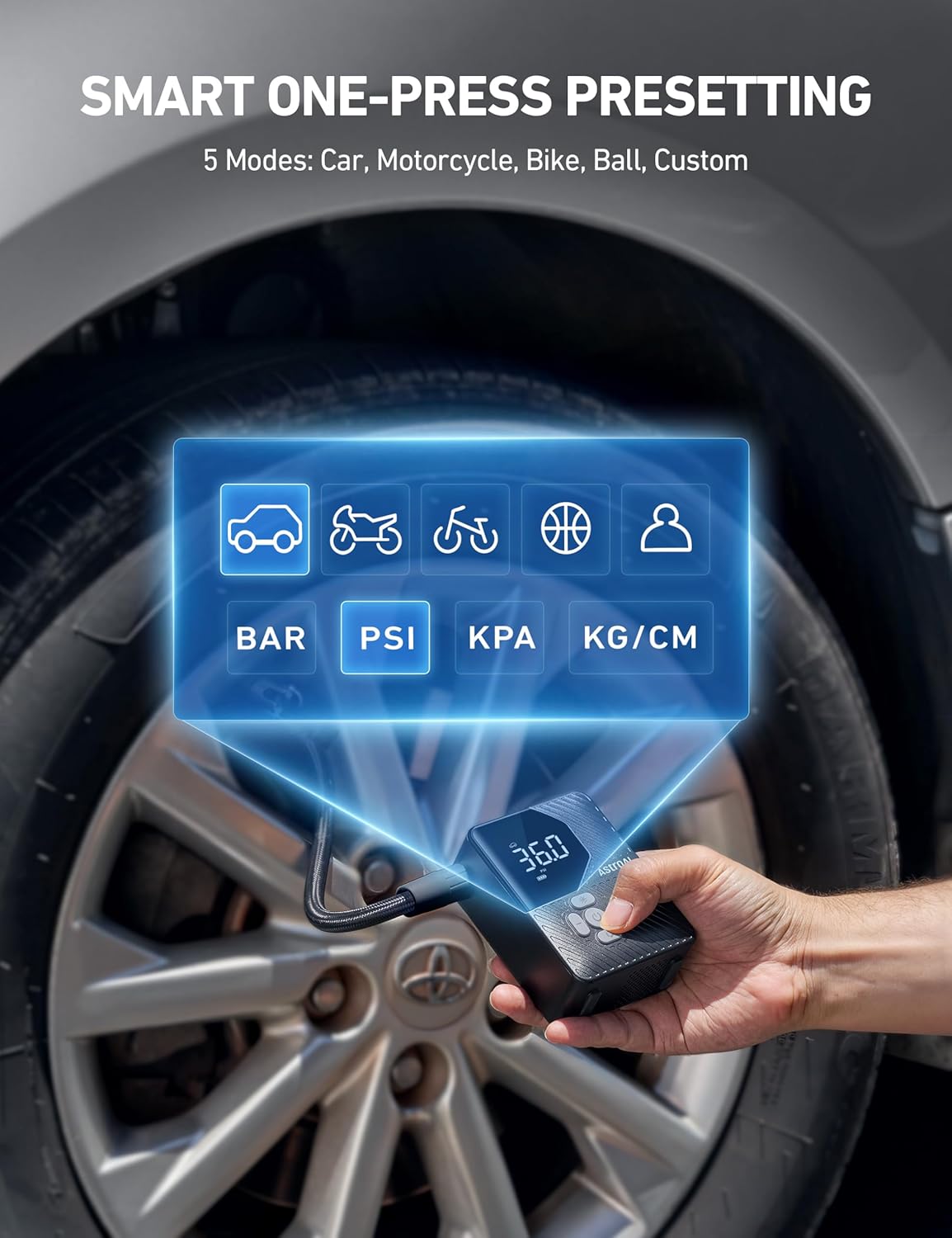 - 5+4 SMART INFLATION SYSTEM: 5 preset modes (car/motorcycle/bicycle/ball/custom), one press to inflate all. 4 professional units to choose from (PSI/BAR/KPA/KG/CM²), these global units easily meet your inflation needs wherever you are.