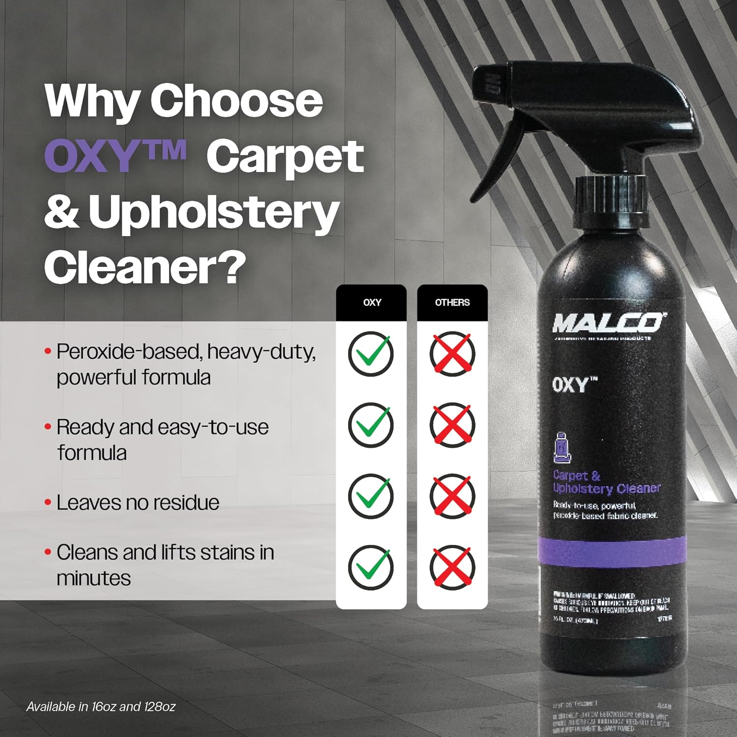 - REMOVES THE TOUGHEST STAINS: Malco OXY Carpet and Upholstery Cleaner is an oxygenated, peroxide based cleaner designed specifically to remove tough stains from vehicle and household fabric, carpet and upholstery.