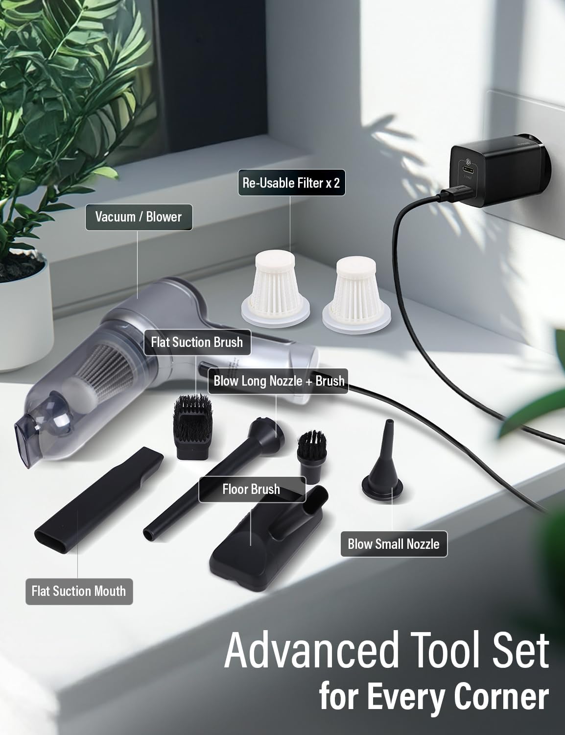 - âś…Includes Multiple Attachments for Deep Cleaning: Equipped with a flat nozzle, brush tool, extension tube, and dual filter, Our cordless vacuum cleaner for car handles gaps, vents, seats, and even pet hair on furniture.