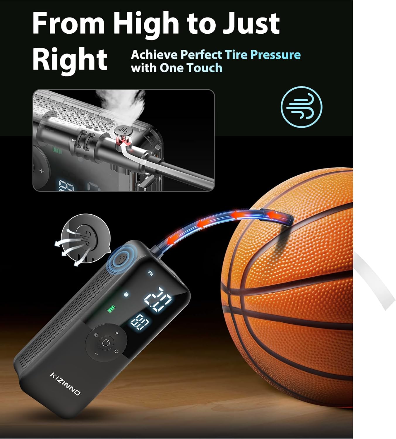 - Powerful, Faster, and Long-Lasting Tire Inflator and PowerBank - KIZINNO portable tire inflator offers powerful performance, inflating car tires, dirt bikes, motorcycles, bicycles, and sports balls quickly. With a 15,000mAh battery, it can handle up to 12 car tires or a month of bike commutes on a single charge and fill 2 flat car tires with ease. It also serves as a power bank for your phone or laptop, ensuring you're always prepared
