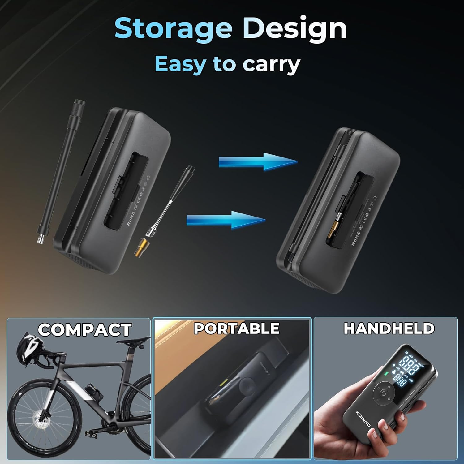 - Portable & Lightweight Design - The T3S portable tire inflator weighs just 1 pound, offering ultimate portability for daily trips. Our cordless air pump features a built-in air hose and a nozzle valve storage slot. Simply carry it to handle all your inflation needs