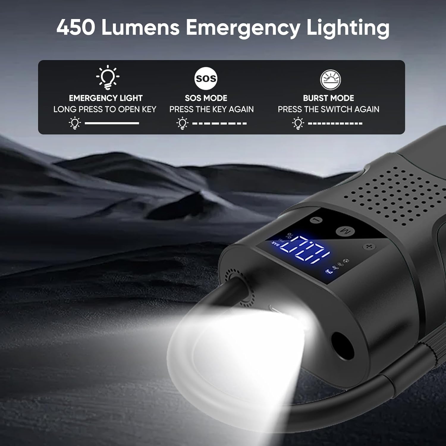 - 【150 PSI MINI PORTABLE TIRE INFLATOR】- Digital tire pressure gauge, built-in LED flashlight for low light conditions; Deflate button for decreasing pressure; Air Hose stores inside. NOTE:Battery performance depends on a number of factors: -Tire Size & Type: Inflating larger or high-pressure tires can drain the battery more quickly. -Temperature: Cold weather can reduce battery efficiency.Proper Charging: For optimal battery performance it is recommended to fully charge the pump before every use.