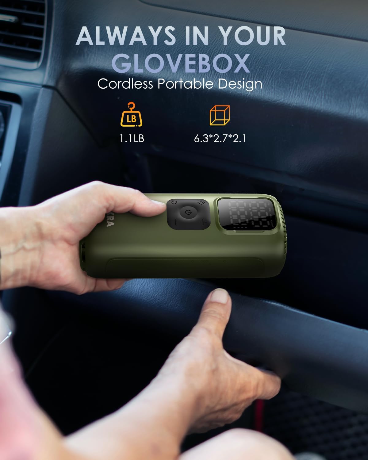 - [The Perfect Choice for Gift]: An ideal gift for your husband, father or friends, this portable air compressor is a practical and thoughtful choice. T22 Tire inflator weighing just 1.14lb makes it effortless to carry, packaged in a premium gift-ready box. This air pump comes in a matte morandi green coating, understated luxury, exuding exceptional style. It combines practicality with stylish looks, ensuring your gift stands out while providing genuine value to the recipient