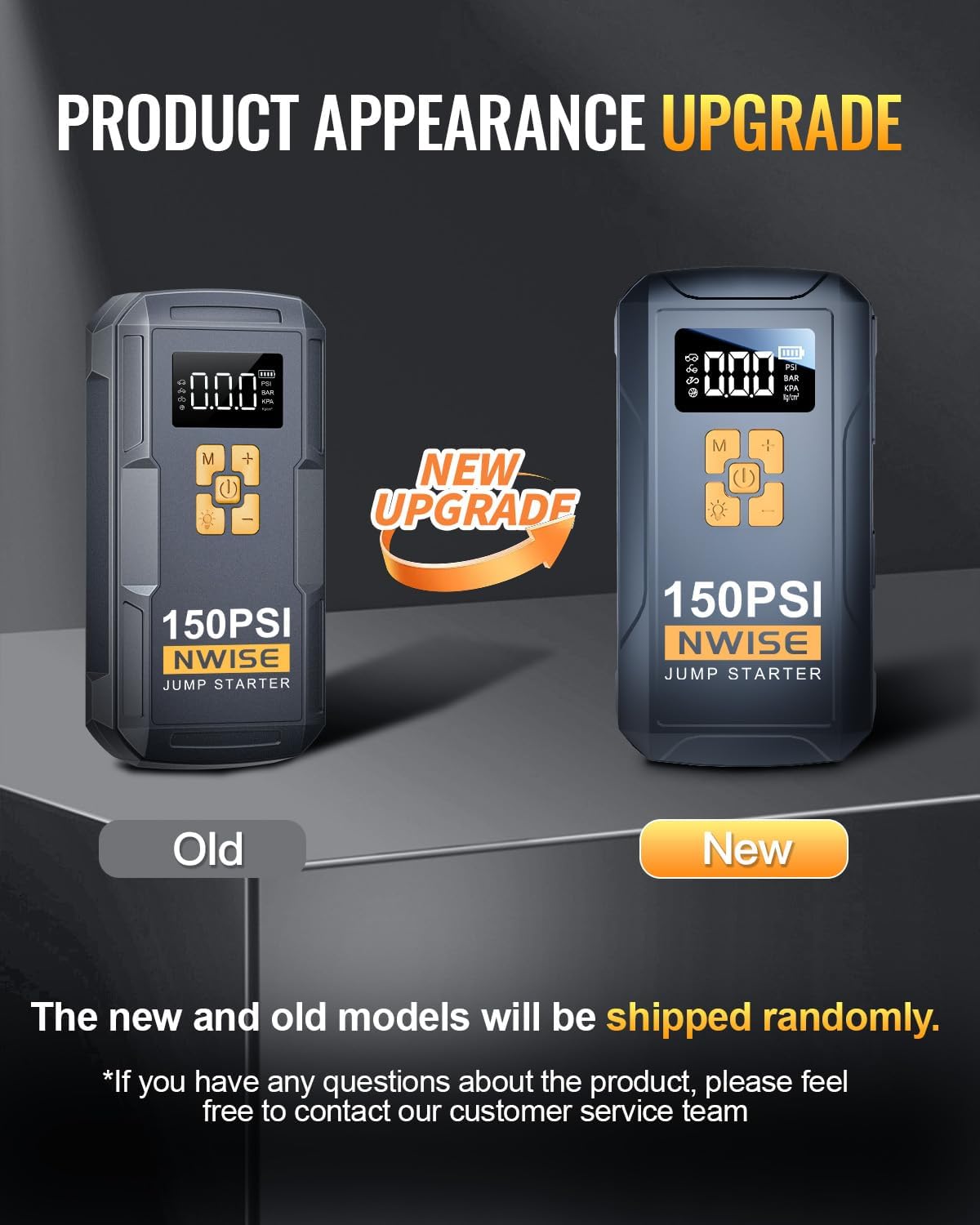 - What's Included:NWISE jump starter with air compressor*1, Smart jumper cables*1, pump tube*1, air nozzle*3, USB to type-C charging cable*1,Gift Box & Storage Bag*1,User Manual*1. If you have any problems during use, please contact us, we will solve it for you within 24 hours.