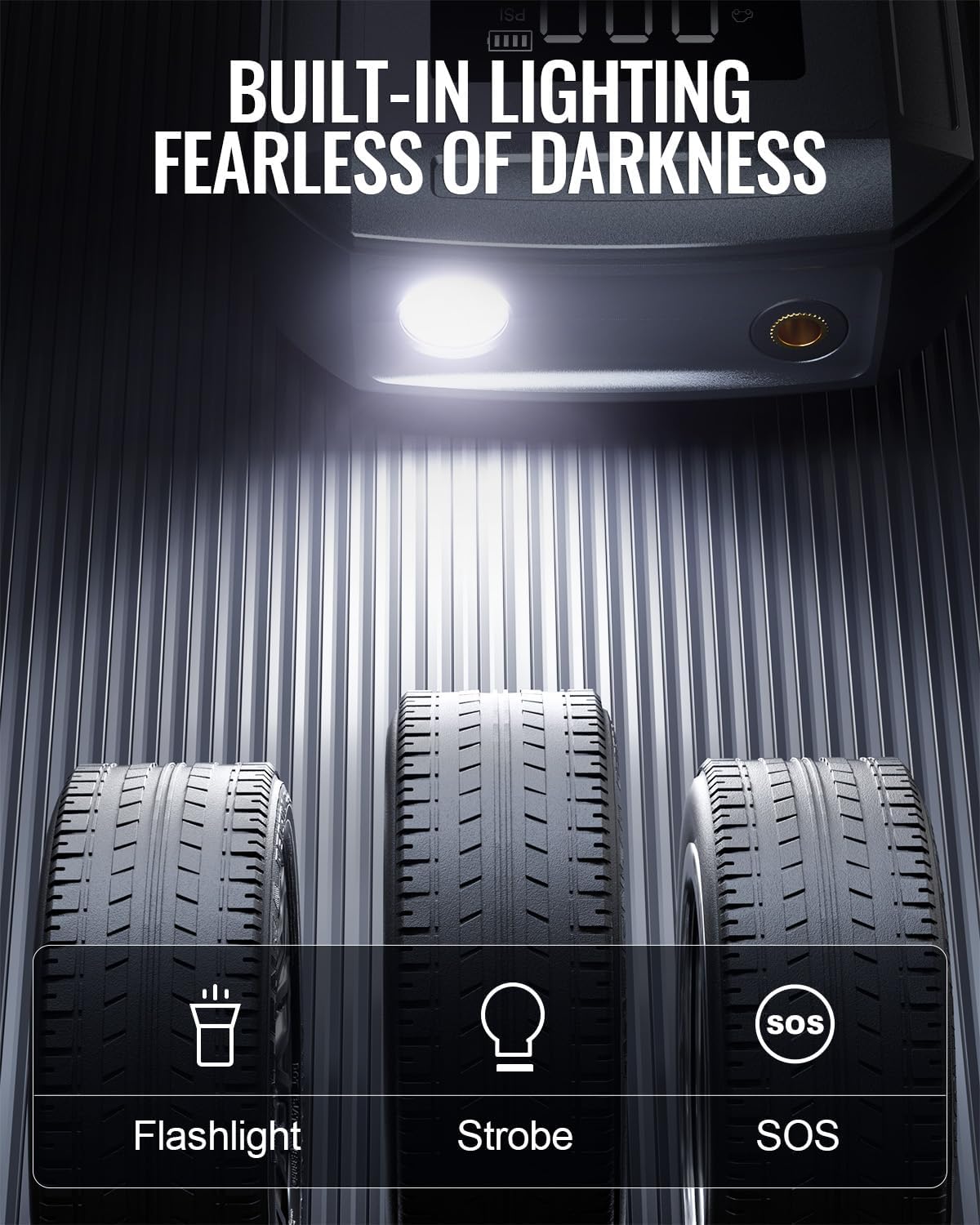 Portable Car Jump Starter with Air Compressor, 150PSI Jump Box Battery Pack with Digital Tire Inflator,12V Booster Pack with Large LCD Display, Emergency Light